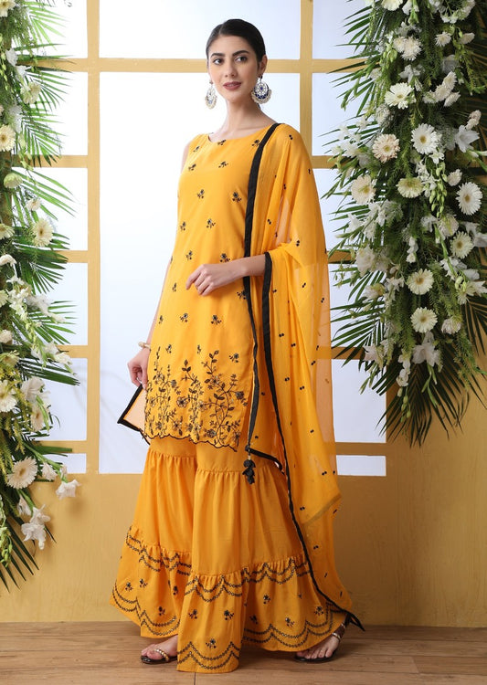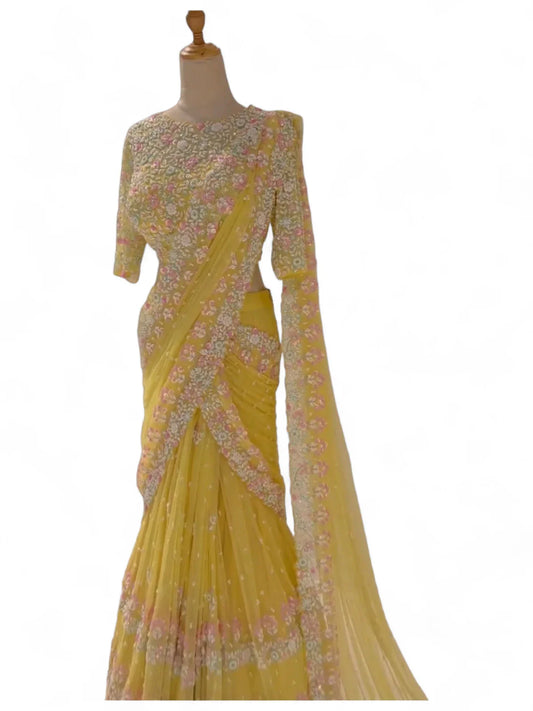 Yellow silk thread and sequence embroidered Ceremonial Gown