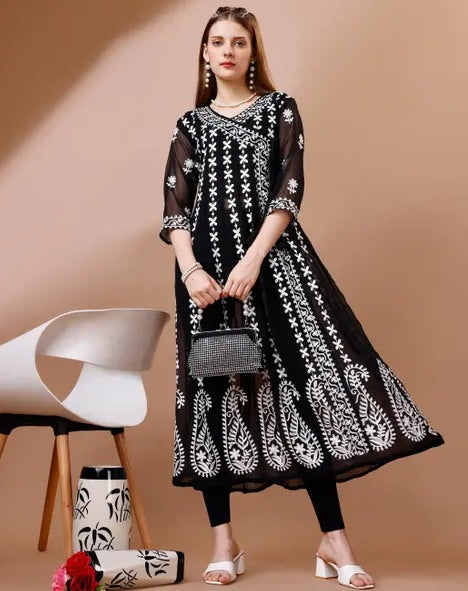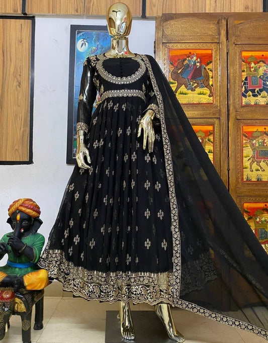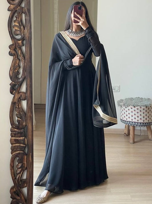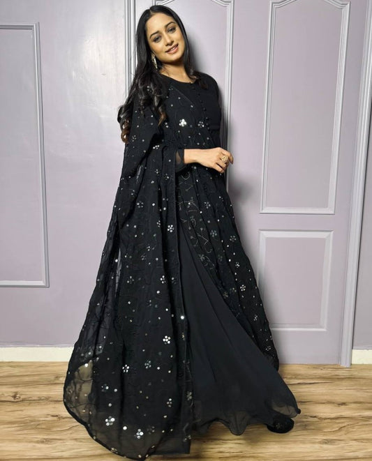 Black georgette heavy flair anarkali suit with heavy work dupatta