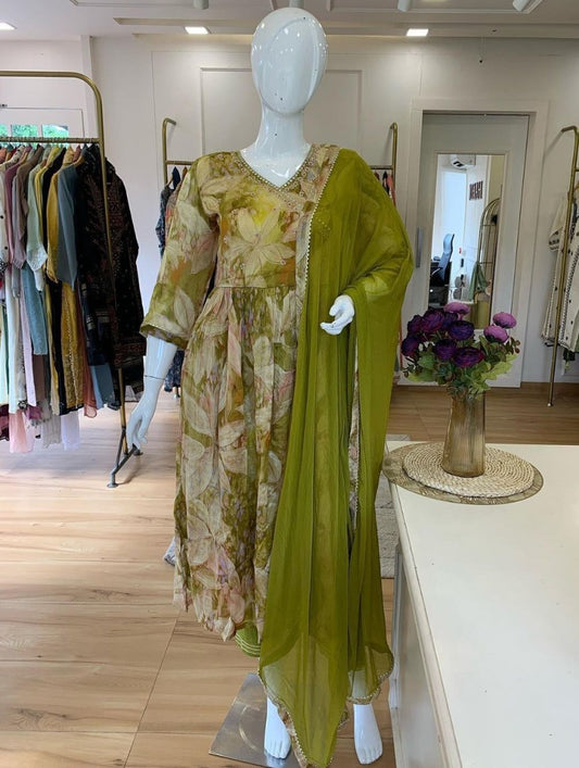Green georgette floral print and handwork anarkali suit
