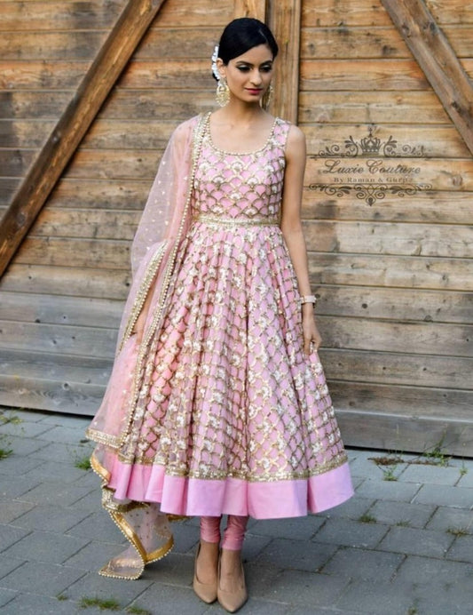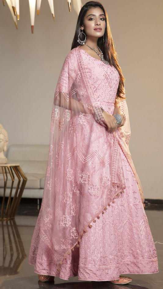 Baby pink net heavy sequence and thread worked anarkali suit