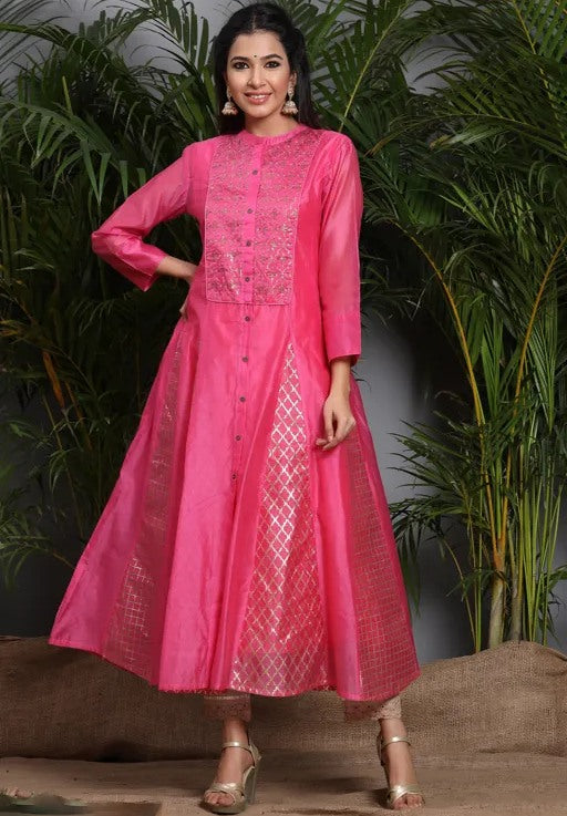Pink chanderi silk embroidered anarkali kurti