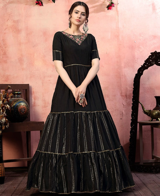 Look beautiful in Navratrilehenga's exquisite gown line, which is to die for. When you go to a party, make those heads turn. It's one of those outfits that helps to highlight a woman's greatest features. Wearing dresses makes you feel instantly opulent and wealthy.