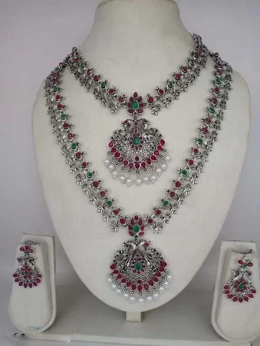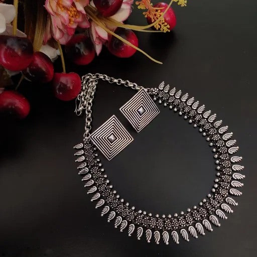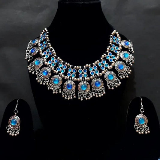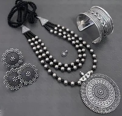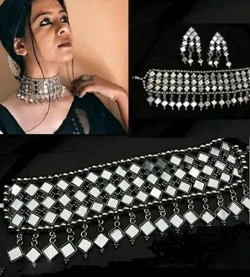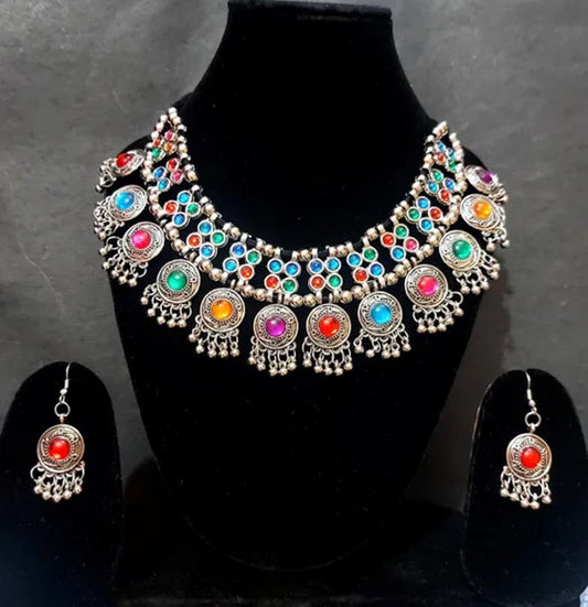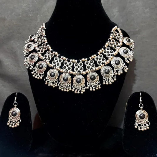 Traditional Afghani Silver Oxidised Choker Necklace & Chain Pendant Combo Set for Women & Girls