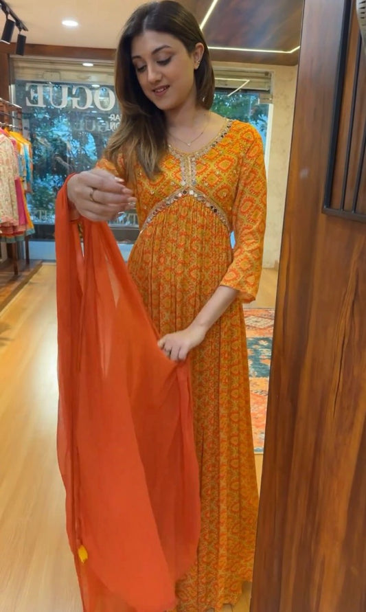 Orange georgette print and handwork alia cut kurti