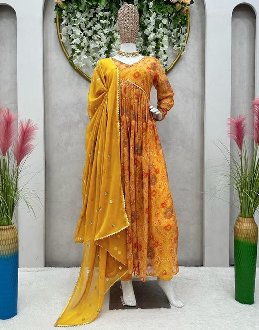 Yellow georgette print and hand worked alia cut kurti