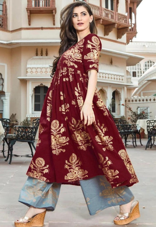 Maroon heavy rayon cotton foil printed plazzo kurti