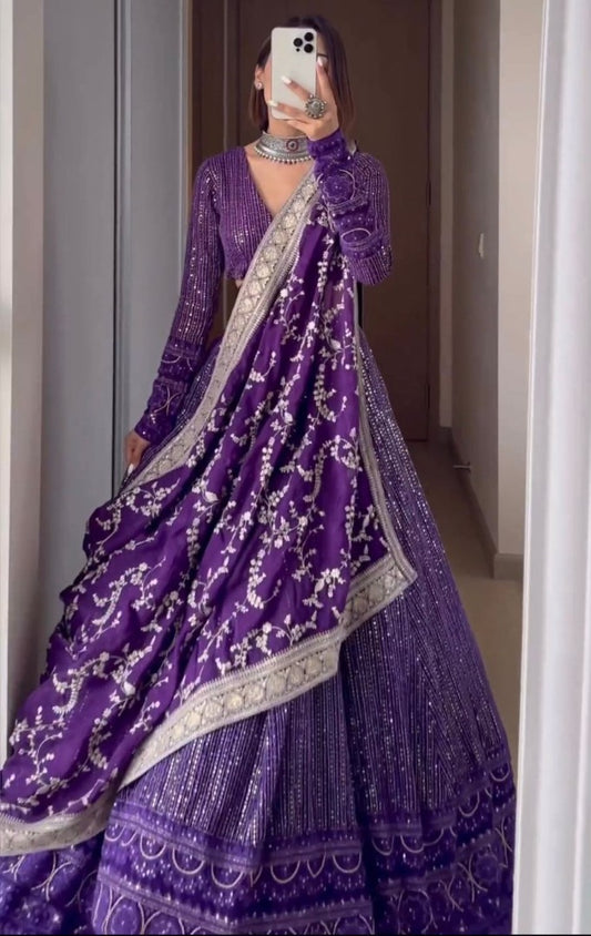 Purple georgette heavy sequence thread work wedding lehenga choli