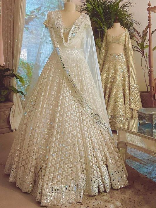 Off white georgette heavy sequence and thread work wedding lehenga choli