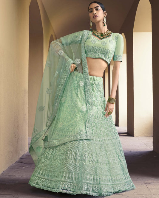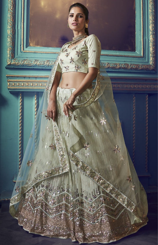 Pista green khadi organza silk chain stick jari work lehenga choli