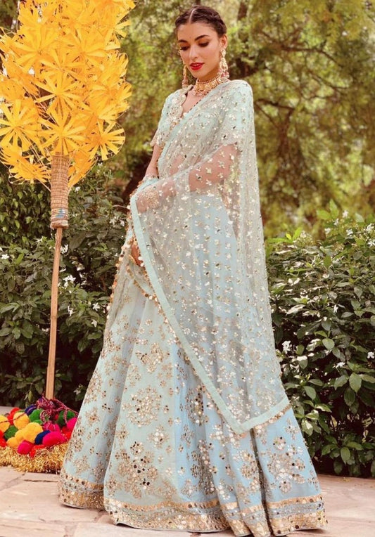 Sea green mulberry silk paper mirror work wedding lehenga choli