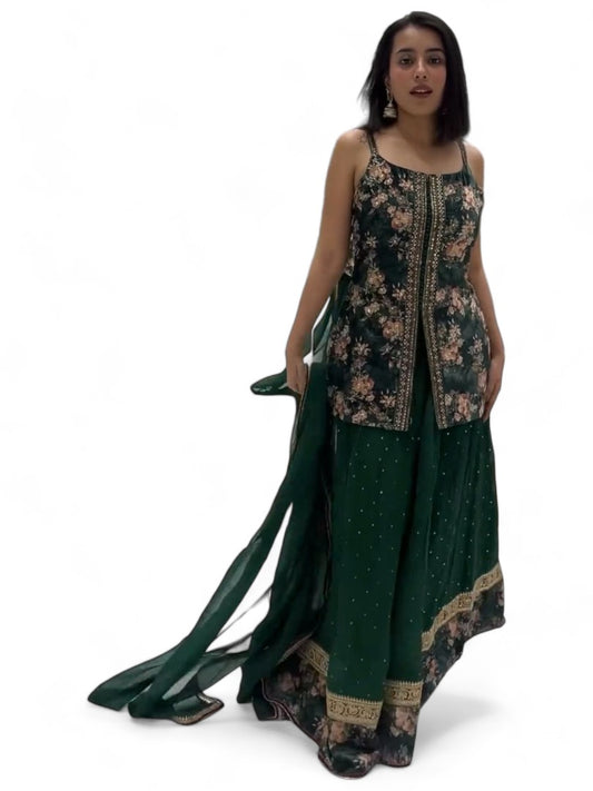 Dark rama heavy work designer indowestern lehenga choli with shrug