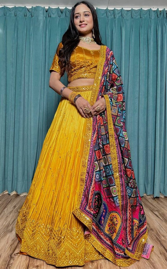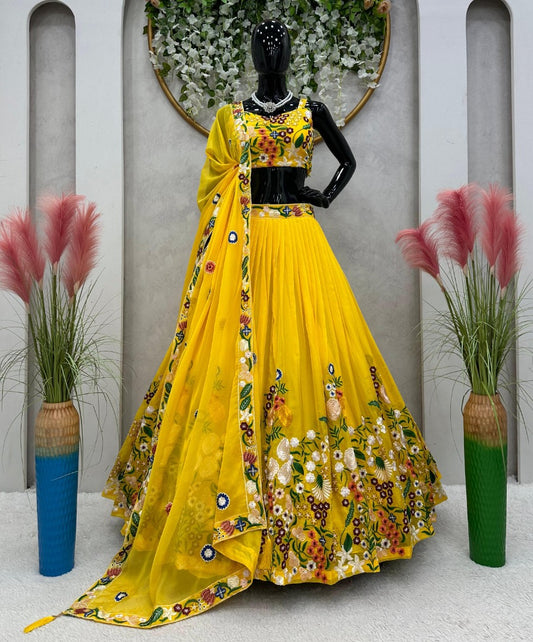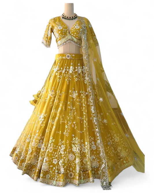 Yellow tabby silk heavy work ceremonial designer lehenga choli