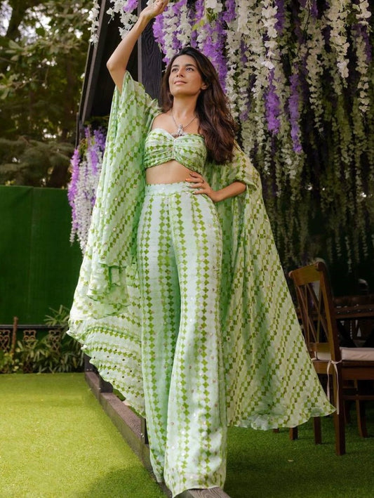 Pista green printed crepe silk indowestern palazzo suit with shrug koti