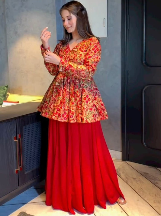 Red butter silk embroidered and printed sharara suit