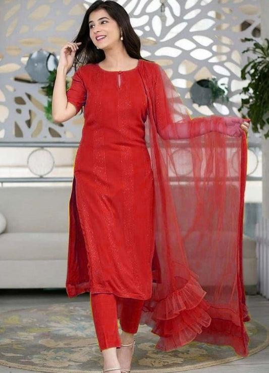 Red tibby silk unstitched salwar suit