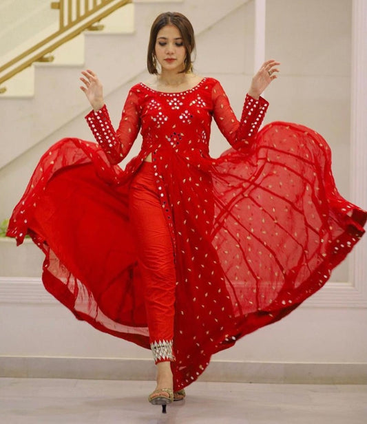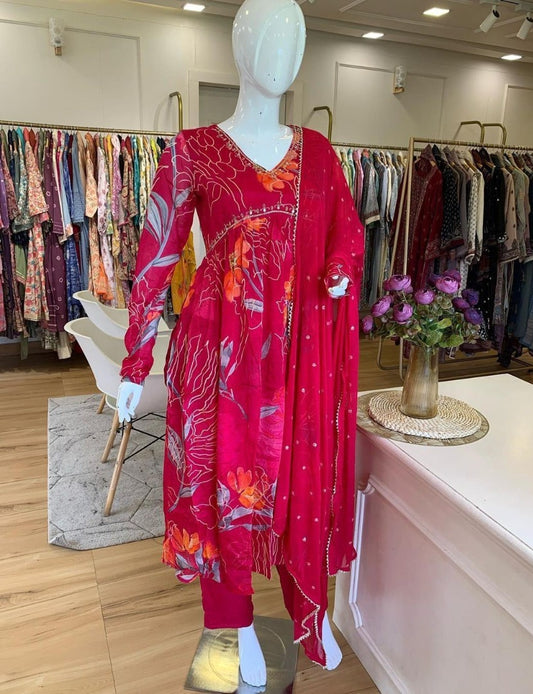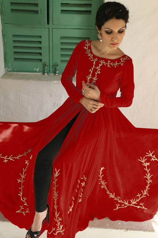 Red georgette floral printed hand work alia cut suit