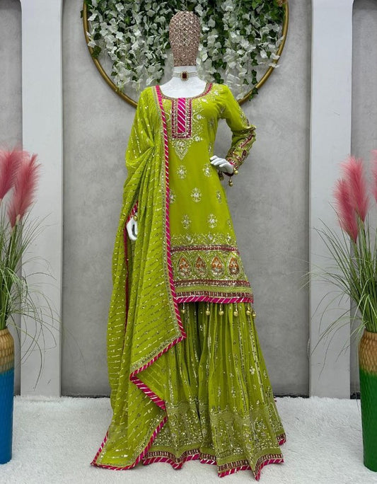 Gharara suits have similar appearance to sharara suits with some differences. Gharara is fit from waist to knees and from knees to toe it's made full flare by adding extra fabrics. And hiding the joint with the heavy lace above the knees. It can be worn in any occasion and looks beautiful. It is paired with short kurta and dupatta.