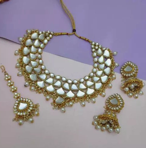 Elevate your wedding ensemble with our exquisite Alloy Gold Plated Kundan Pearl Jewelry Set. Crafted with precision, this set exudes timeless elegance and sophistication.