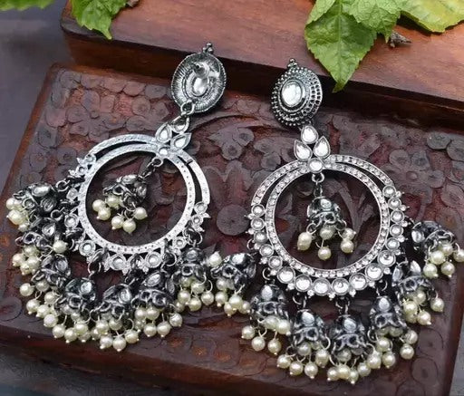 Alloy oxidised silver kundan pearl jhumka earrings