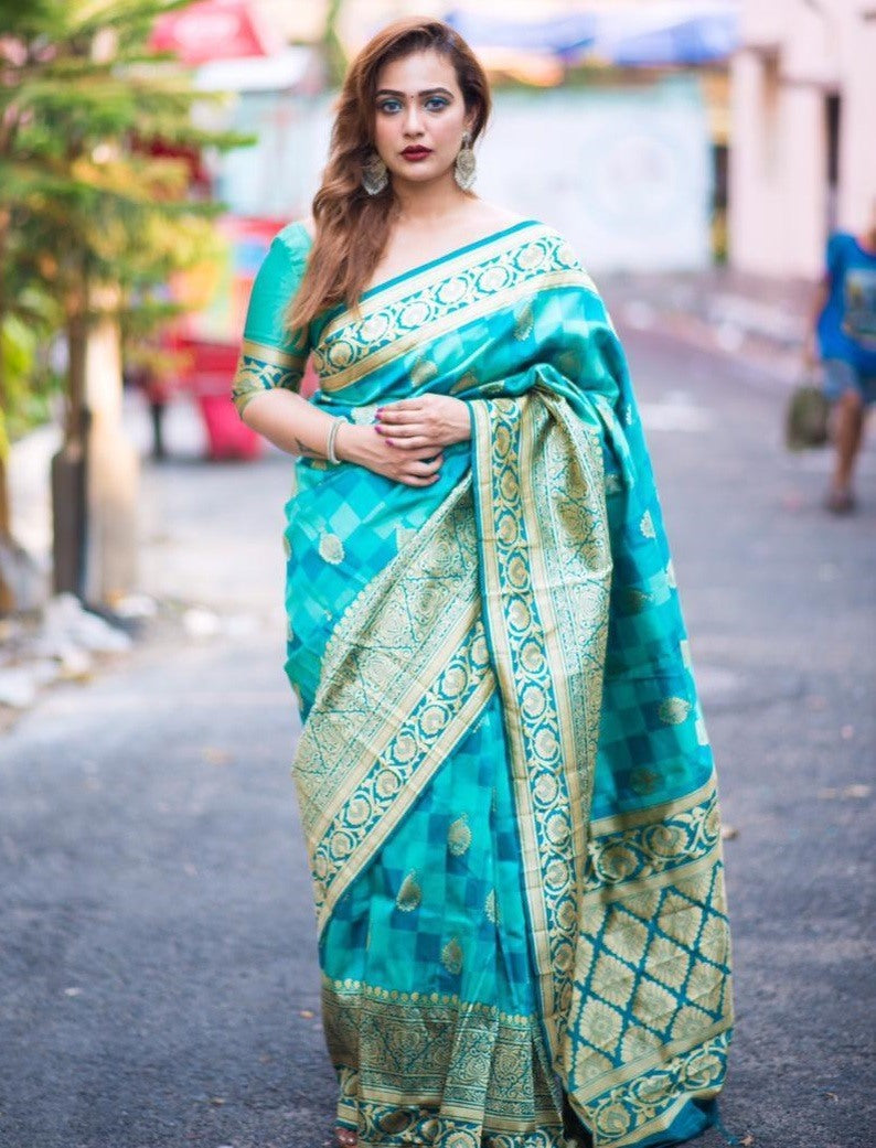 Banarasi Cotton silk weaving saree with fabulous checks weaves all over contrast border and exclusive pallu