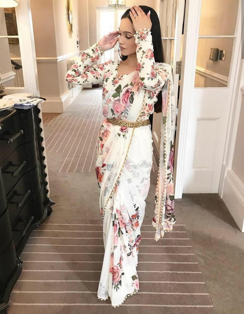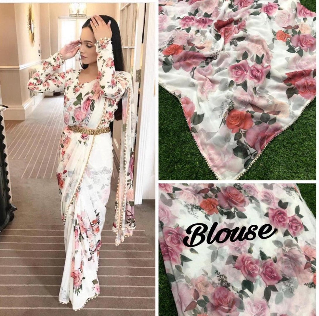 beautiful floral digital printed saree with moti lace