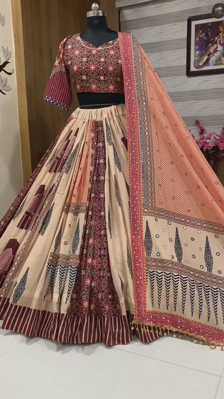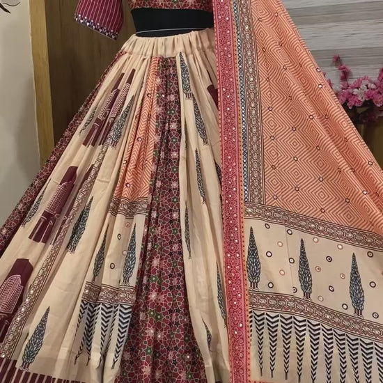 Step into the festive season with this elegant Beige Cotton Print Mirror Work Navratri Lehenga Choli. Perfect for Garba nights and Navratri celebrations, this ensemble blends traditional charm with modern design, ensuring you stand out with grace and style.