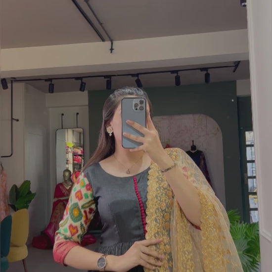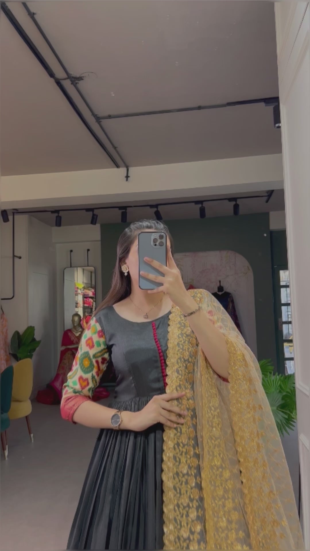 This Black Dola Silk Gown, adorned with foil work and a luxurious net dupatta with sequins and thread embroidery, is designed to make you shine at any special occasion. The elegant design and comfortable fit ensure you look your best while feeling confident and graceful. Ready to dazzle in black?