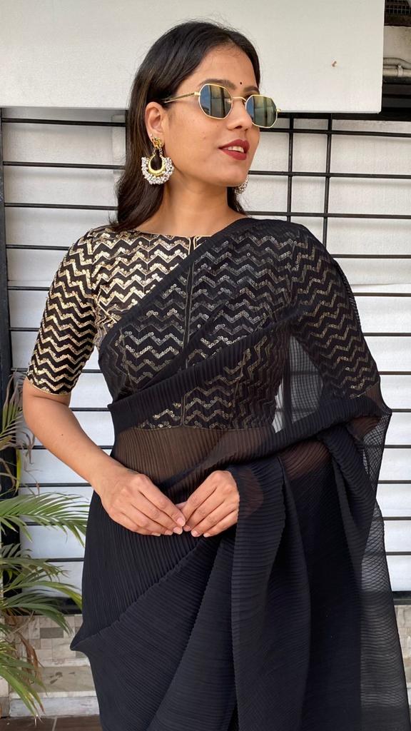 Black georgette pleated partywear saree with heavy sequence work blouse