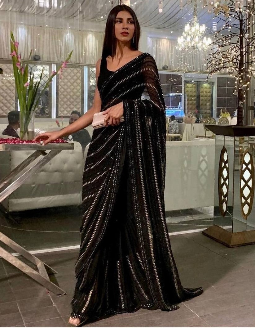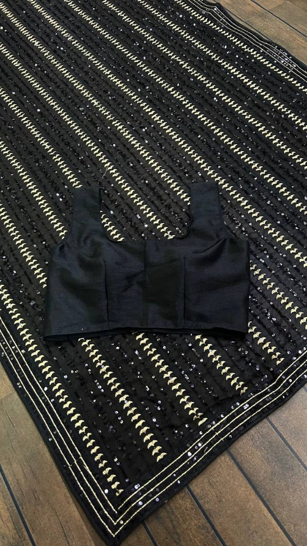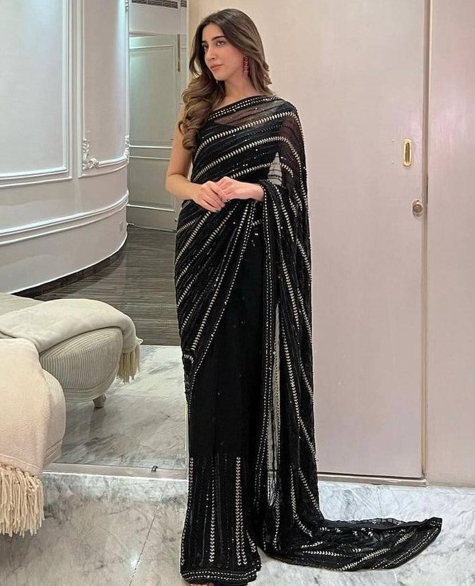 Introducing the perfect addition to your special occasion wardrobe - the Black Heavy Embroidered Sequence Embroidery Work Party Wear Saree. Made from luxurious georgette fabric, this saree features intricate sequence embroidery work and a beautiful zari border. The Banglori satin blouse adds to the elegance of this saree and has a sequence border at the waist to give it an extra touch of glamor. Perfect for any special occasion you may have, this saree is sure to make you look and feel your best.