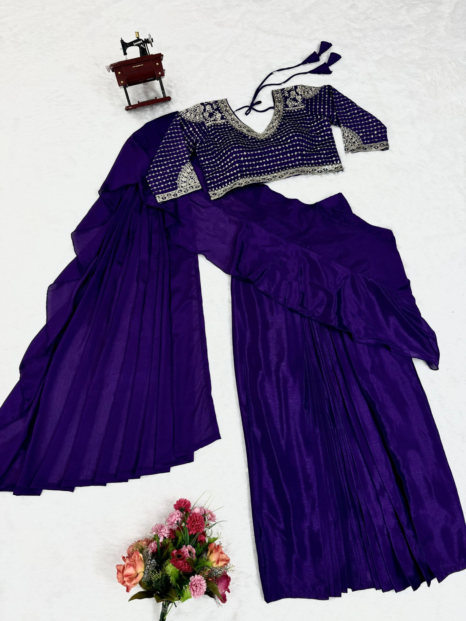 Feel effortlessly elegant and party-ready with this stunning blue pre-stitched saree. This saree is perfect for any celebration and features fancy ruffles and is designed for easy wearing with a side zipper and elastic fit. The accompanying fully stitched blouse adds a touch of sparkle with its sequins and intricate threadwork.