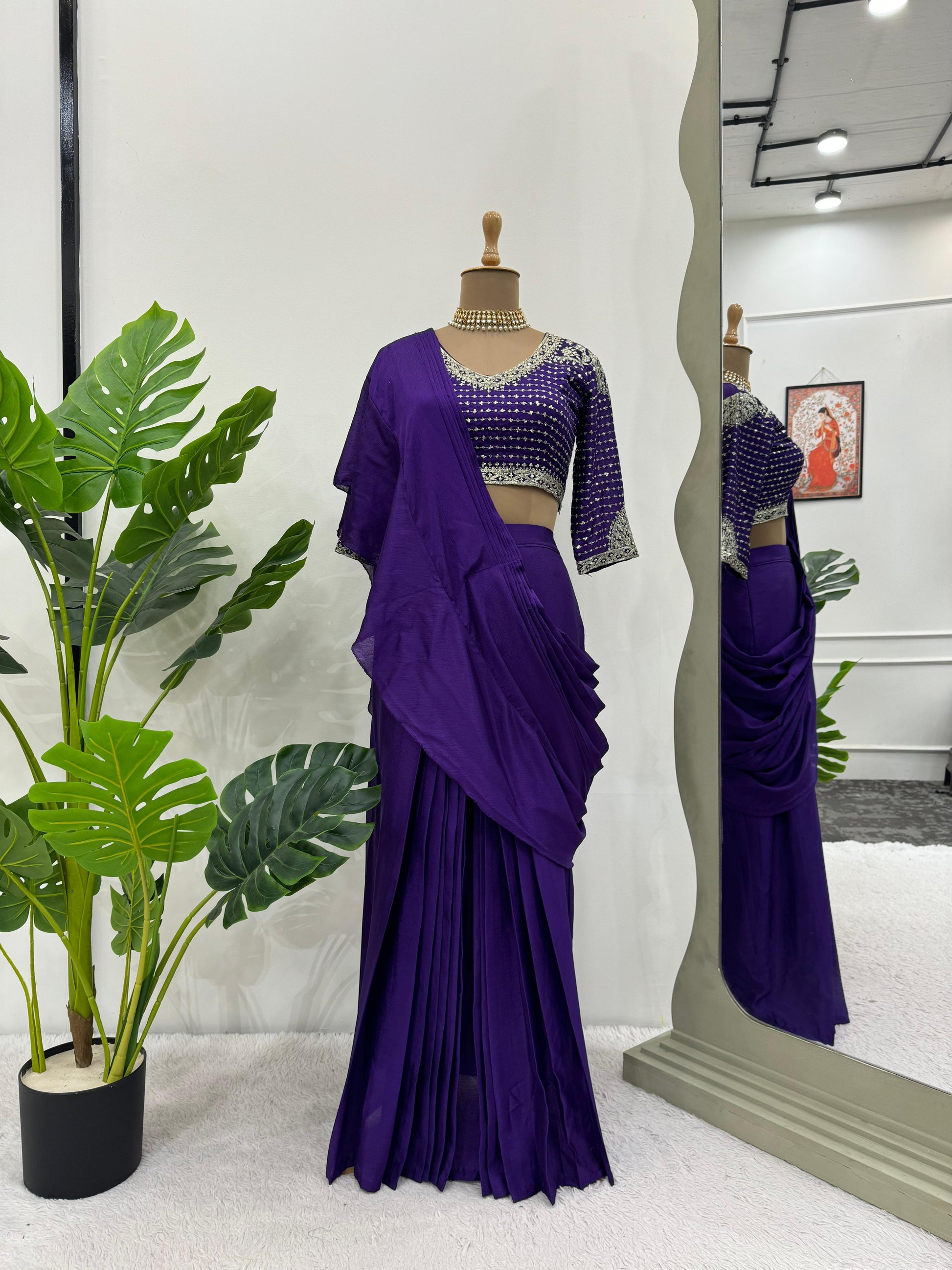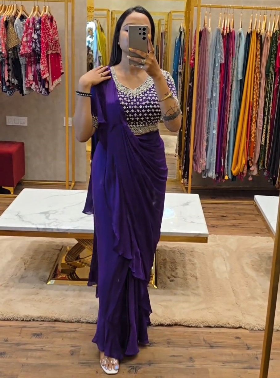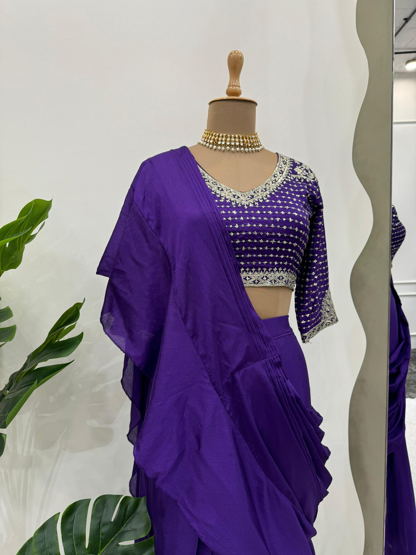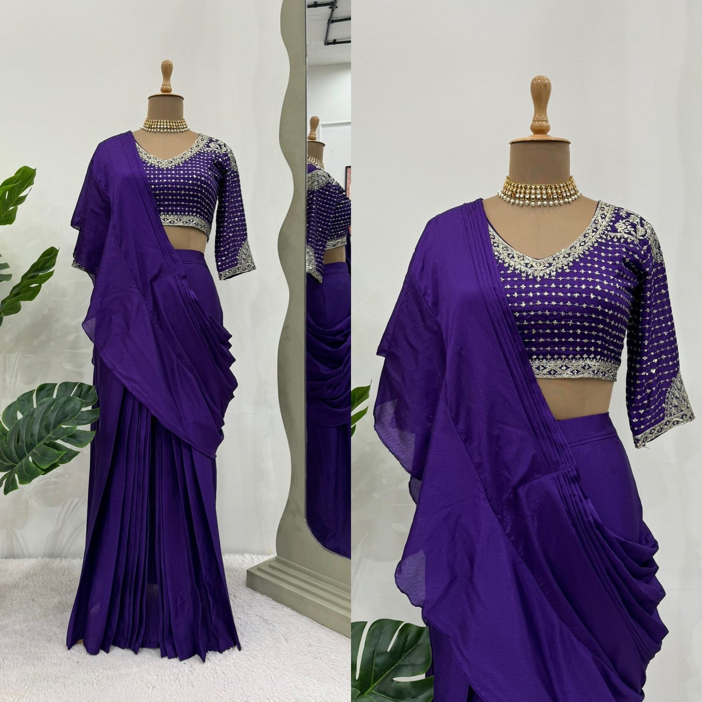 The blue Pre-Stitched Draped Ready-to-Wear Party Saree is the ultimate choice for women seeking elegance and convenience for festive occasions. Made from luxurious Chinon fabric, this saree features intricate fancy ruffles that add a touch of glamour. Its pre-draped style with a side zipper and elastic ensures a perfect fit, making it ideal for weddings, parties, and celebrations. The fully stitched blouse, adorned with exquisite sequins and threadwork, complements the saree beautifully. This saree is perfect for those looking for ready-to-wear sarees, designer sarees for parties, and stylish Indian ethnic wear. Available in multiple sizes, this saree caters to women across India, including Tamil Nadu (சிறந்த ரெடி டு வெர் பார்ட்டி புடவை), Karnataka (ಅತ್ಯುತ್ತಮ ರೆಡಿ ಟು ವೇರ್ ಪಾರ್ಟಿ ಸೀರೆ), Kerala (മികച്ച റെഡി ടു വെയർ പാർട്ടി സാരികൾ), Andhra Pradesh and Telangana (ఉత్తమ రెడీ టు వేర్ పార్టీ చీరలు), Maharashtra (सर्वोत्तम रेडी टू वेअर पार्टी साडी), Odisha (ସର୍ବୋତ୍ତମ ରେଡି ଟୁ ଵେଅର ପାର୍ଟି ସାରି), and beyond.
