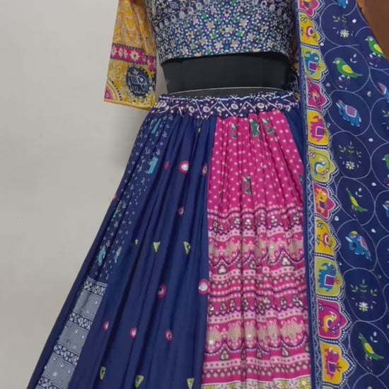 Celebrate Navratri with the stunning Blue Print Mirror Work Gujarati Garba Navratri Lehenga Chaniya Choli. This lehenga choli is designed with heavy muslin cotton and intricate digital prints and is perfect for festive celebrations and cultural events. The real mirror work adds a touch of elegance, making it a standout piece for Garba nights.