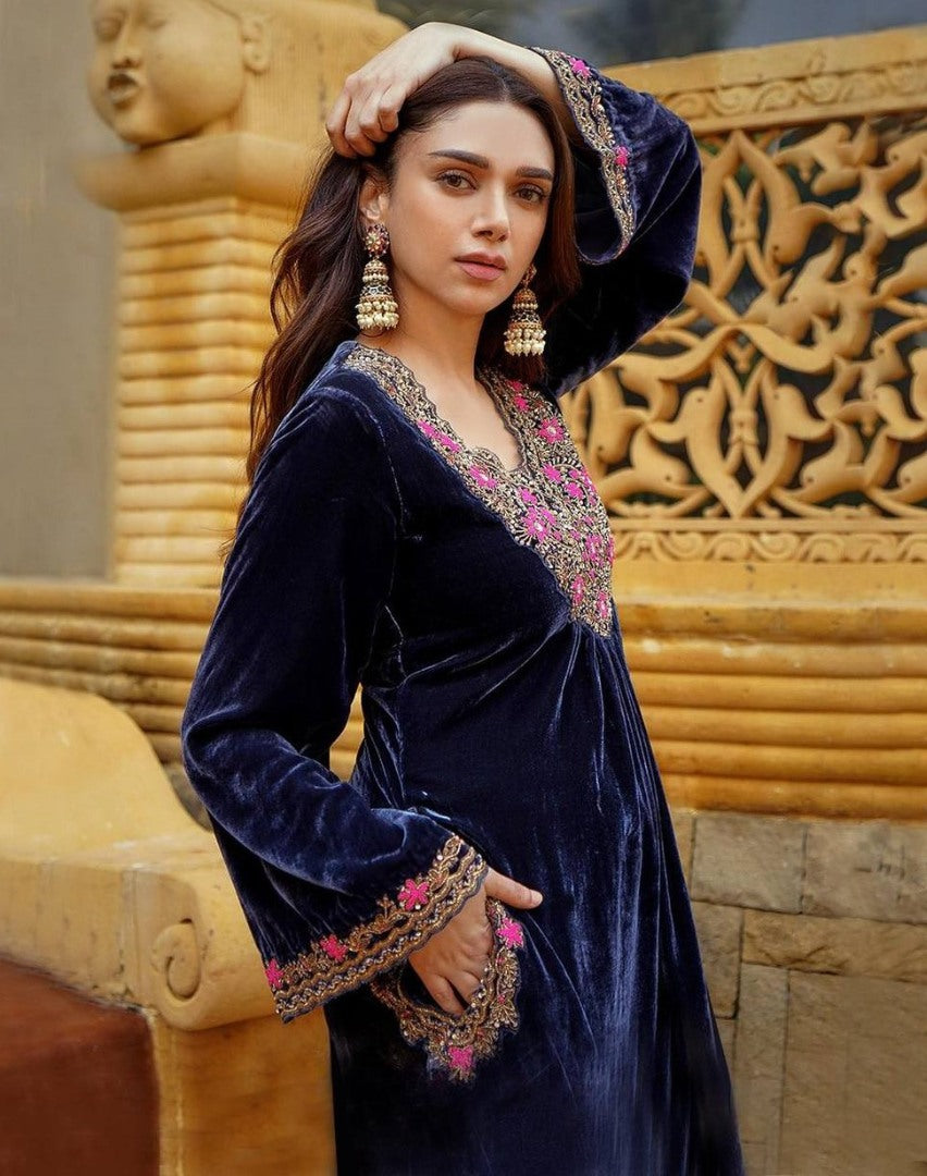 - Top: Heavy 9000 Velvet with Sequin Embroidery Work (Fully Stitched) and featuring convenient side pockets