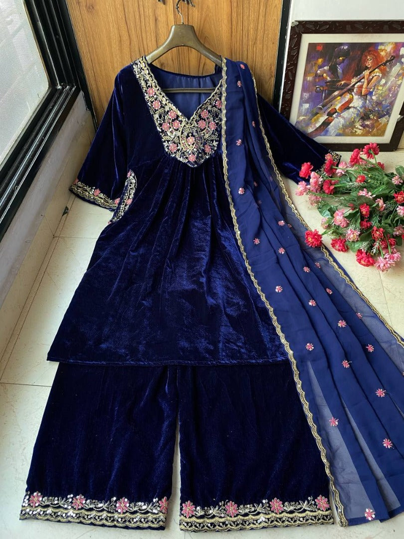 Elevate your style with our exquisite Dark Blue Velvet Embroidered Party Wear Palazzo Suit. Crafted with precision and adorned with intricate sequin embroidery, this outfit is a true masterpiece.