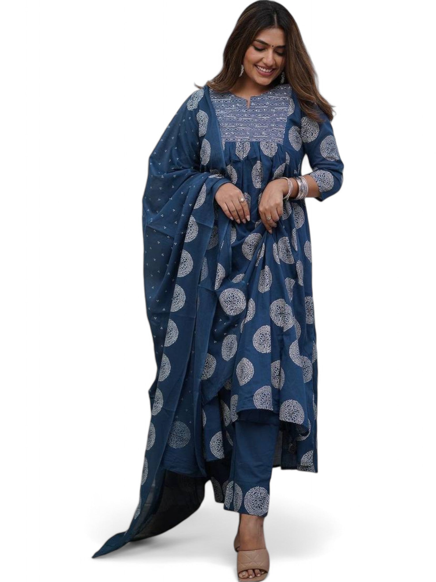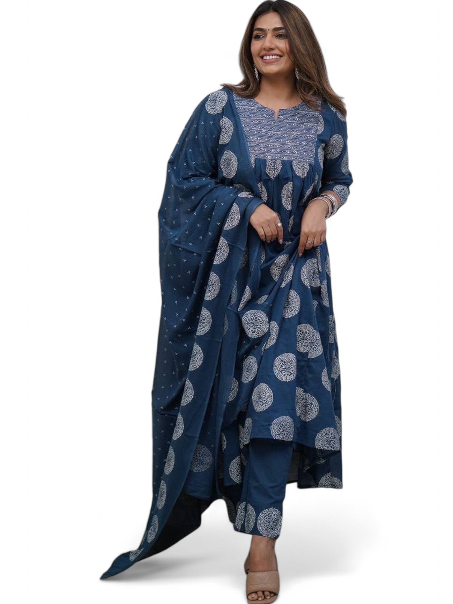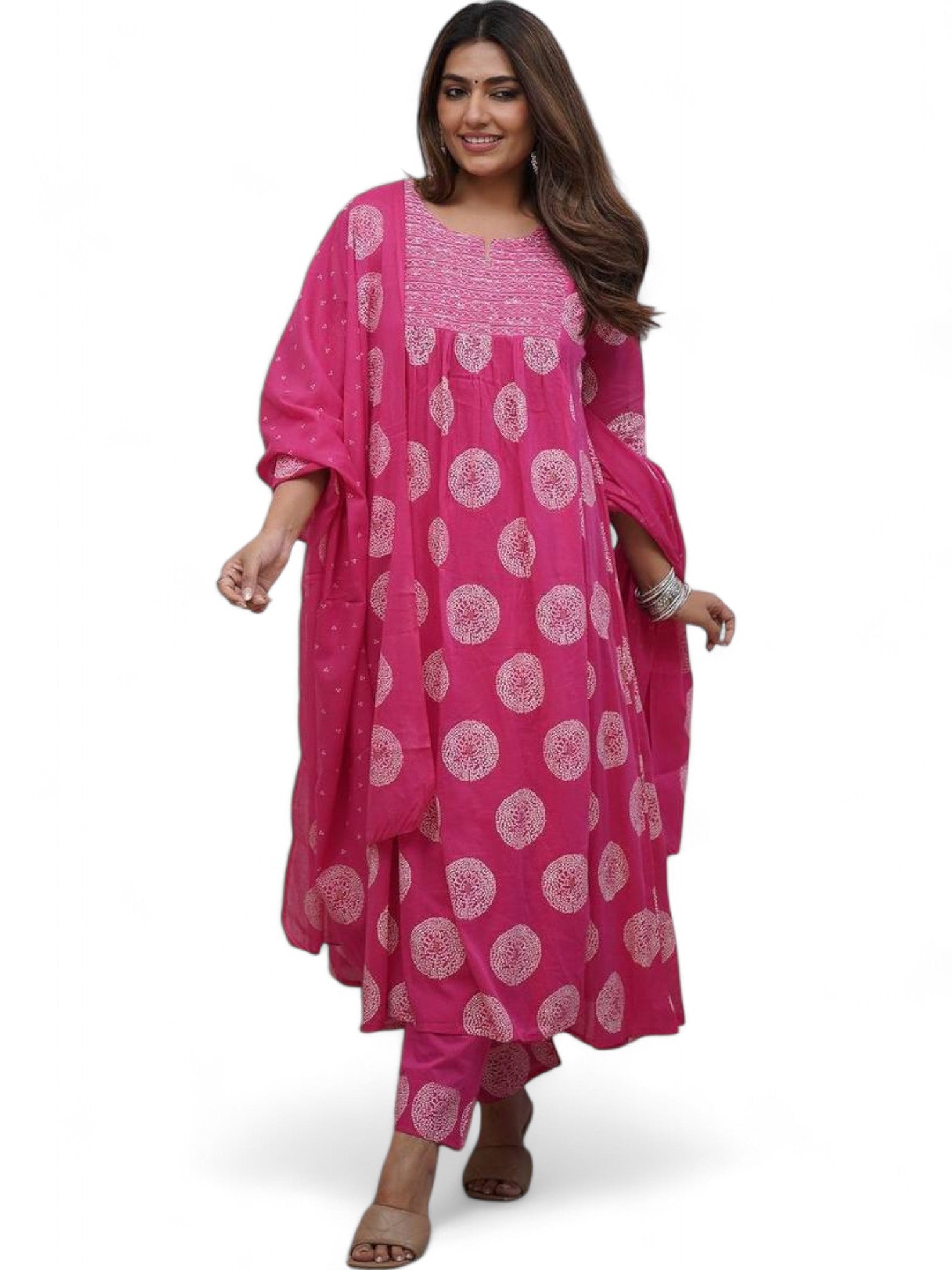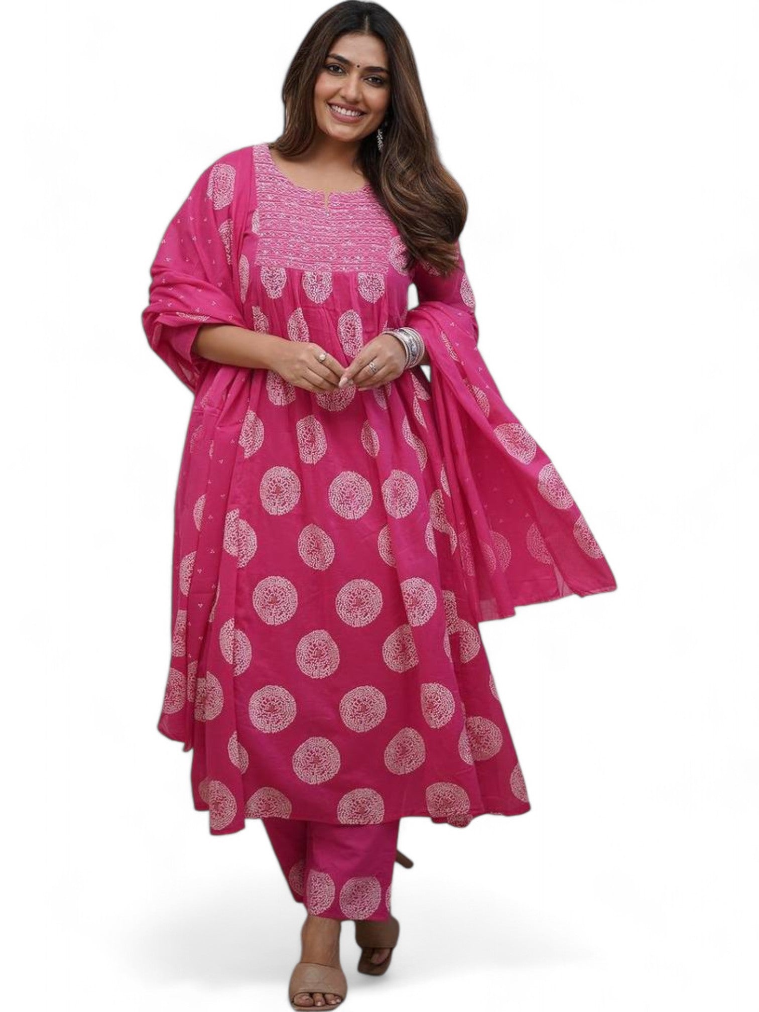 Step into timeless elegance with this Designer Cotton Block Print Anarkali Suit. Crafted from fine pure cotton, this suit features a fully flared block print Anarkali with exquisite embroidery handwork on the neckline. The ensemble is completed with a straight-cut pant and a beautifully designed full-length mulmul dupatta. This three-piece set offers both style and comfort, making it perfect for any occasion.