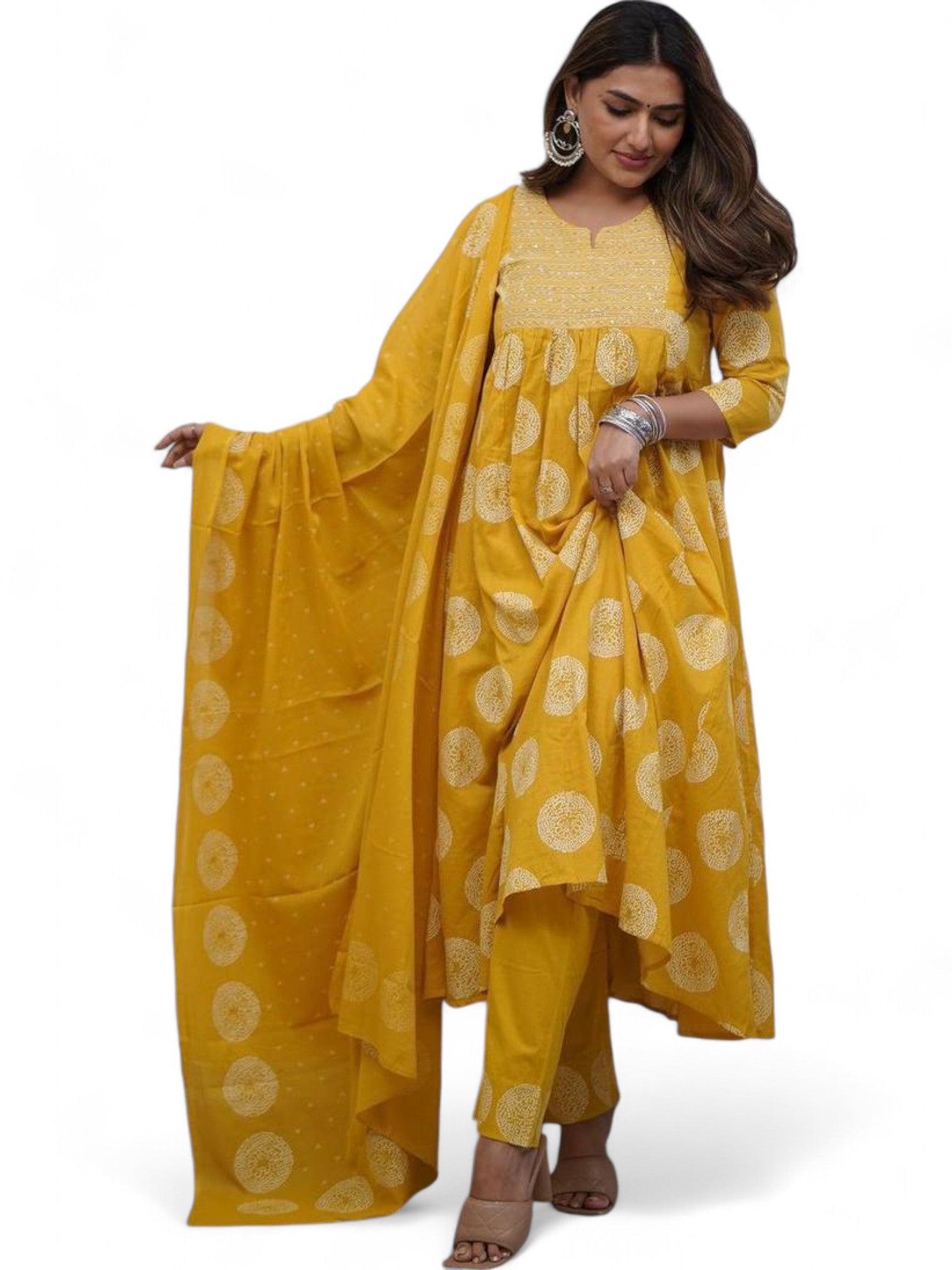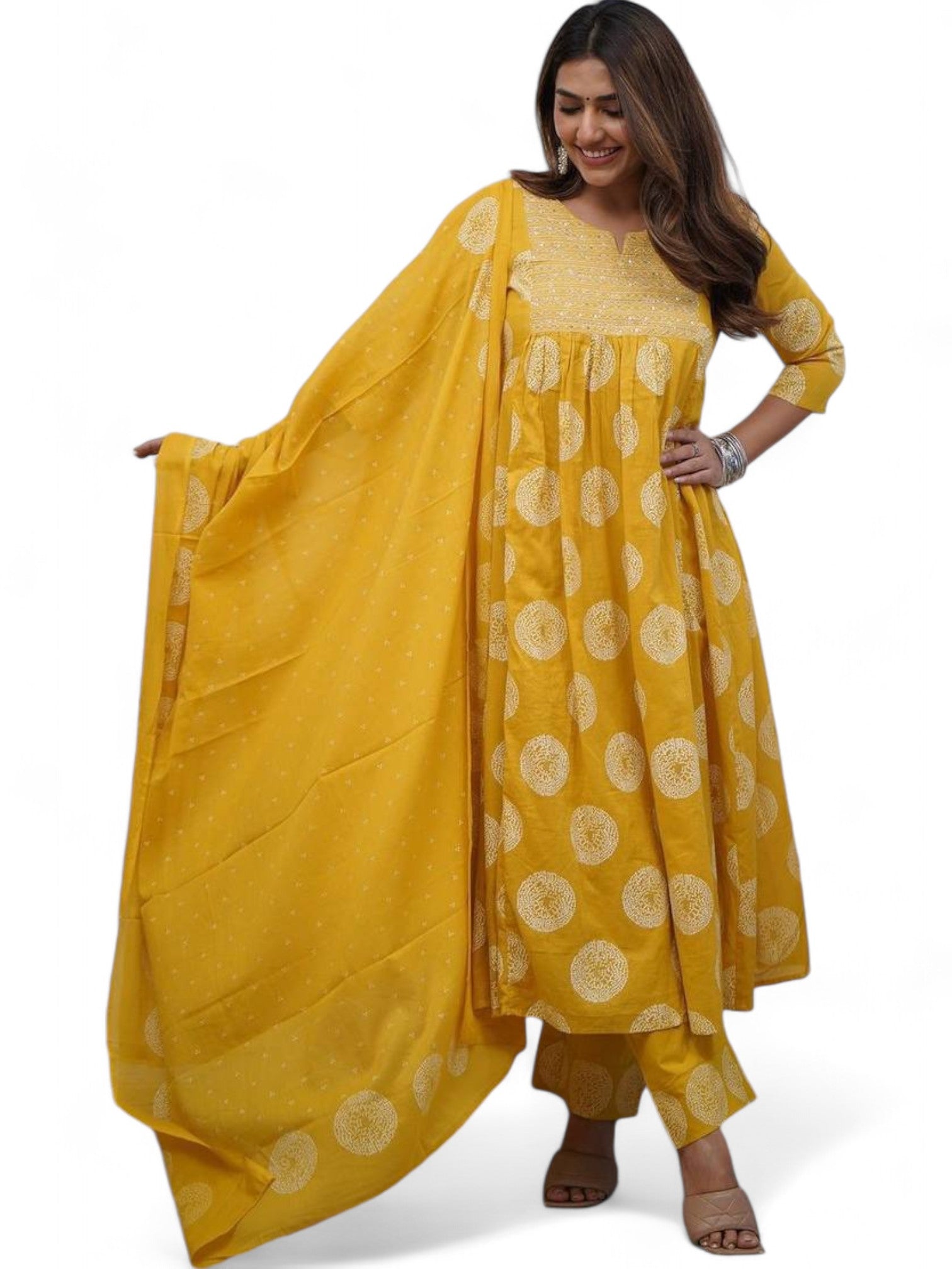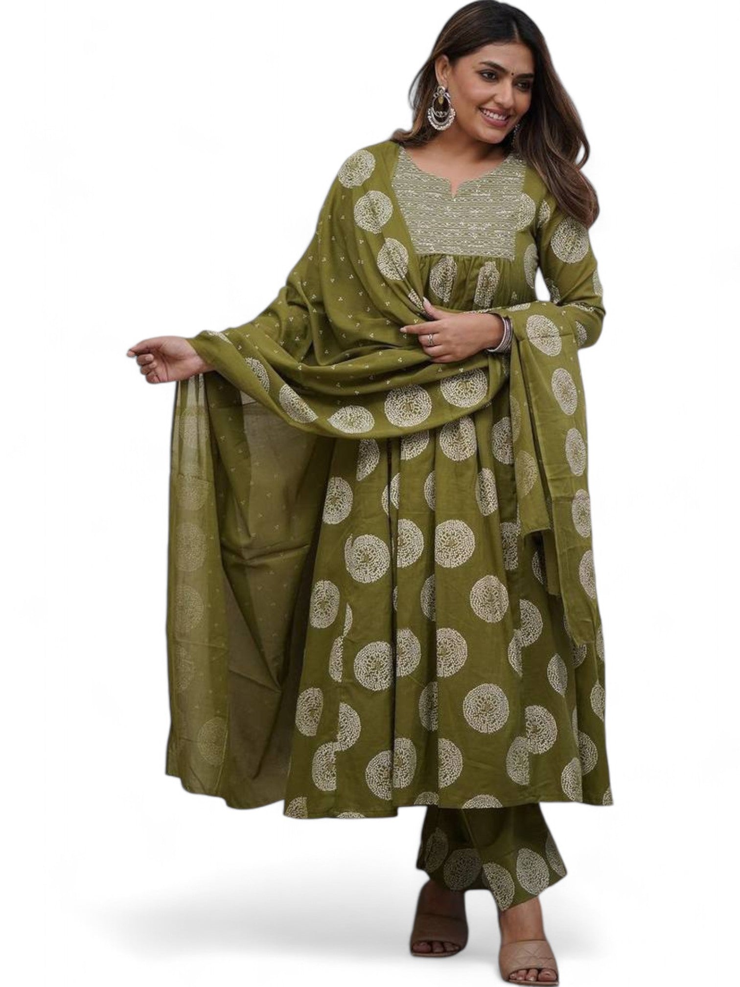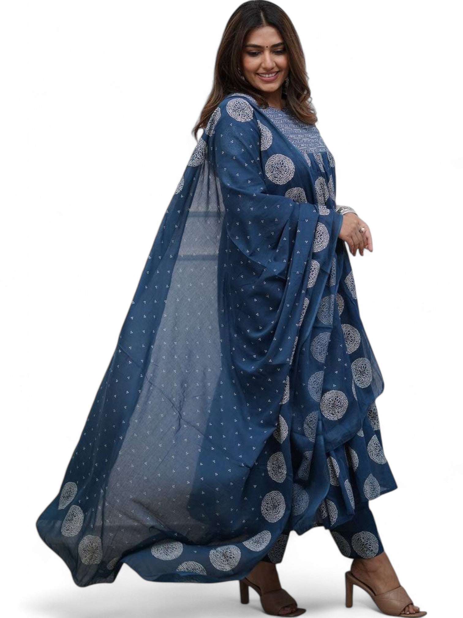 Step into timeless elegance with this Designer Cotton Block Print Anarkali Suit. Crafted from fine pure cotton, this suit features a fully flared block print Anarkali with exquisite embroidery handwork on the neckline. The ensemble is completed with a straight-cut pant and a beautifully designed full-length mulmul dupatta. This three-piece set offers both style and comfort, making it perfect for any occasion.