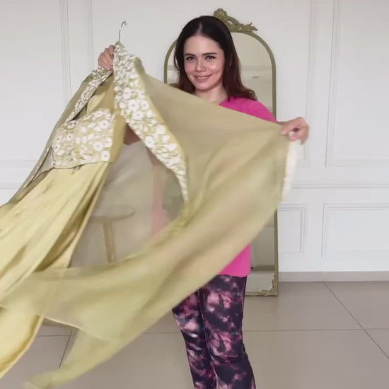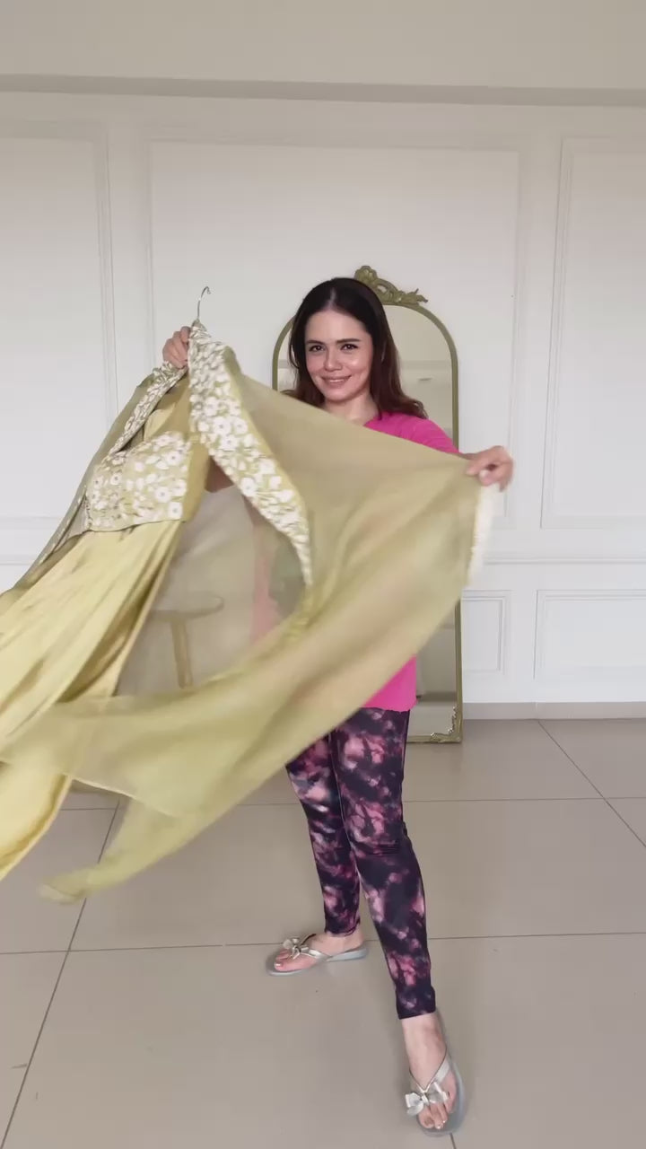 Step into contemporary elegance with this Golden Satin Thread Sequins Work Indo-Western Dhoti Suit, perfect for festive events and weddings. The choli is crafted from luxurious Japan satin, featuring intricate thread and sequin work. The ready-to-wear draped dhoti, made from matching Japan satin, is designed with a comfortable side zip and sequin embellishments. Completing the look is a beautifully embroidered tabby organza shrug, featuring threadwork and a lace border for a chic, modern twist.