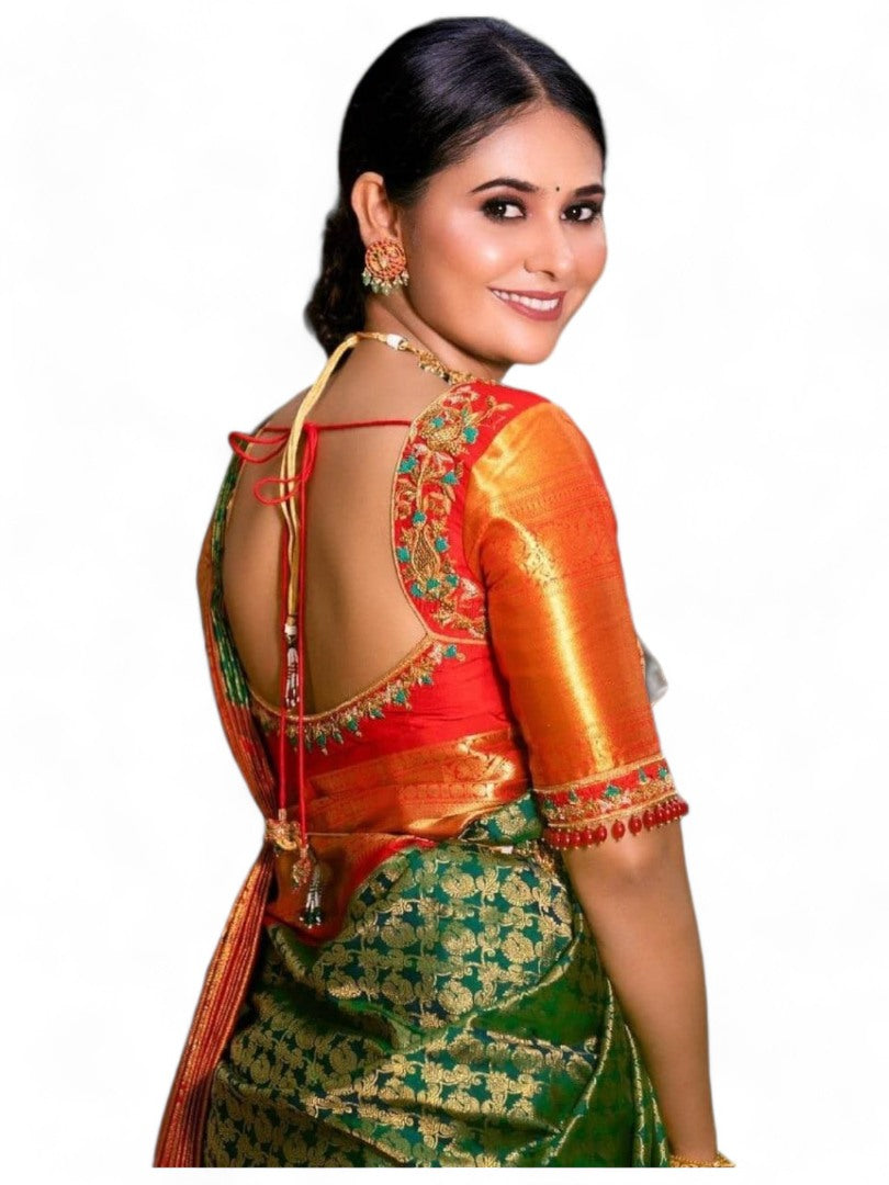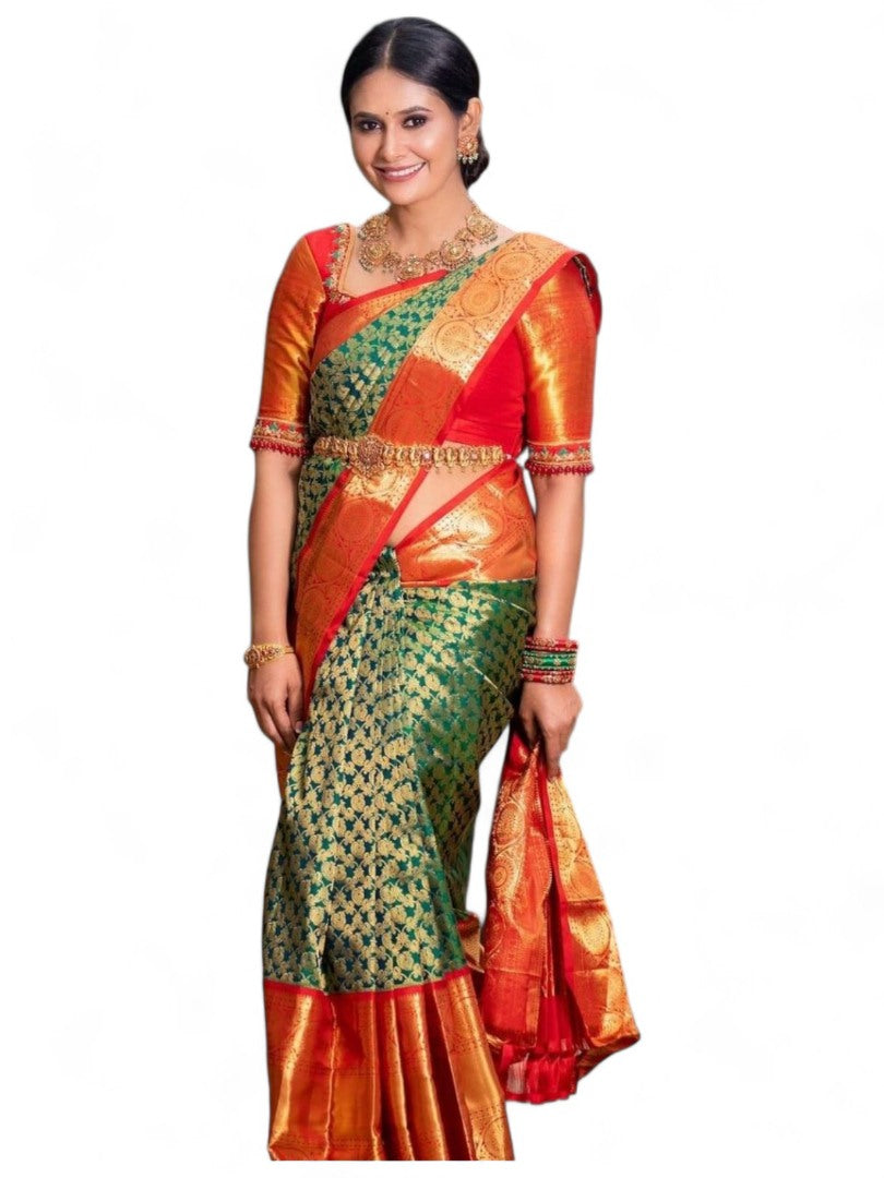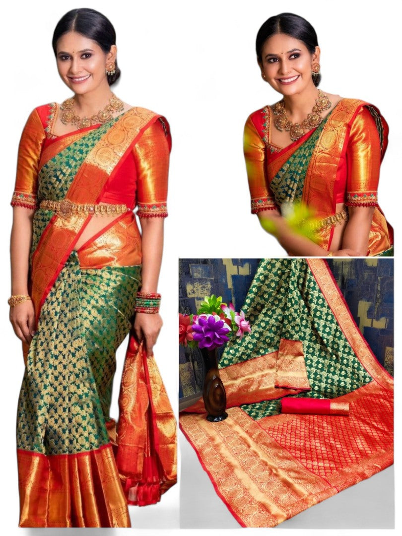 Step into timeless elegance with our Green Banarasi Silk Wedding Saree. Expertly crafted from luxurious Banarasi soft Lichi silk, this saree showcases a beautifully designed rich pallu and intricate jacquard work across the entire length. Paired with an exclusive jacquard border blouse, this saree exudes traditional charm and sophistication, making it a perfect choice for weddings and grand occasions.