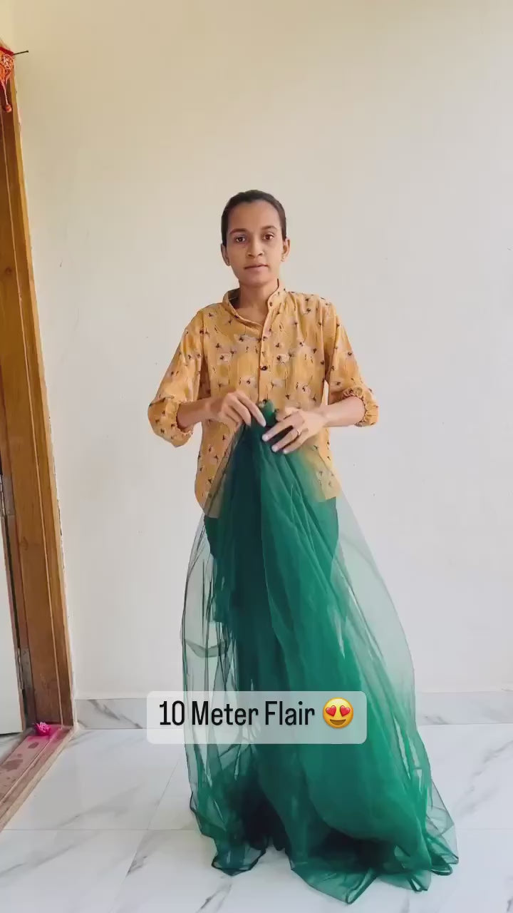 This stunning gown features a voluminous 10-meter flair, giving it a graceful and flowing silhouette. The soft crepe inner ensures comfort, while the plain yet elegant design makes it a versatile choice for various events. Ready to make a lasting impression?