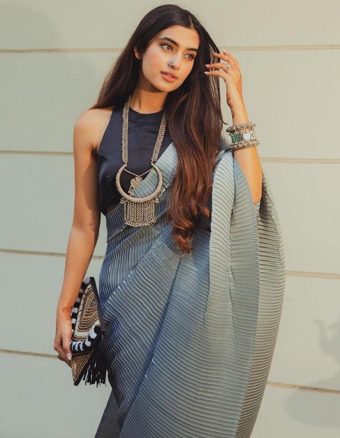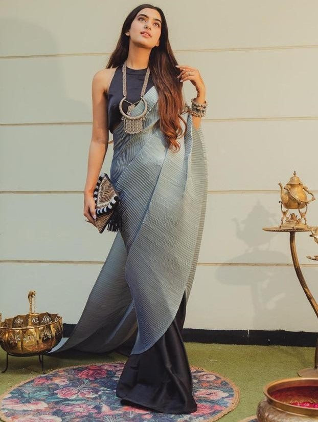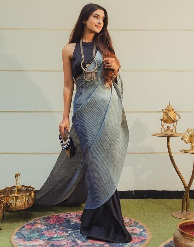 Grey and black crushed shiny silk designer half half saree -