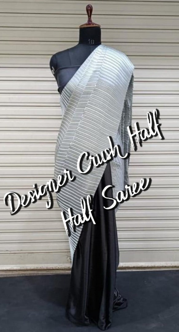 Grey and black crushed shiny silk designer half half saree