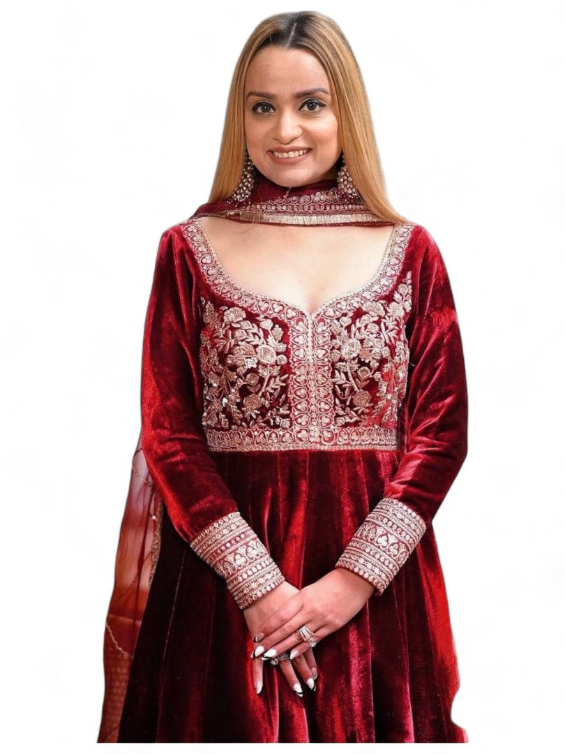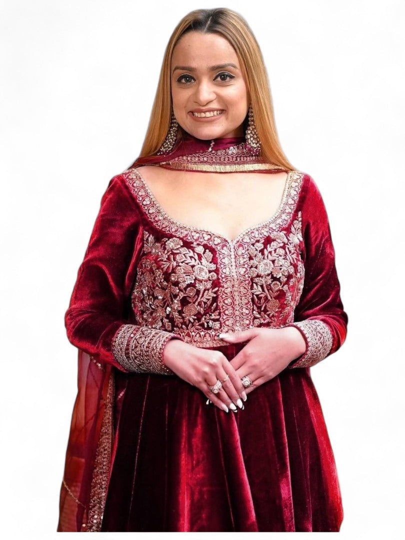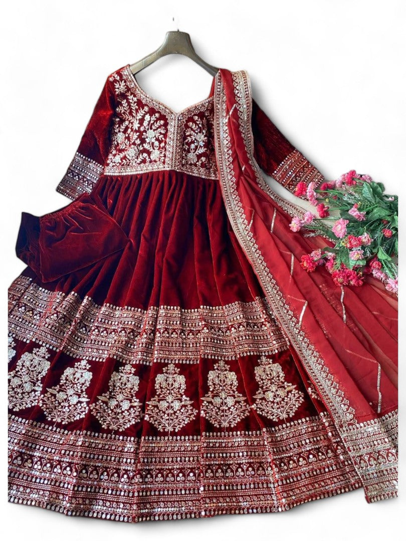 Complete your bridal look with our stunning Maroon Velvet Heavy Work Wedding Anarkali Suit. This exquisite ensemble features intricate sequence embroidery work on heavy velvet fabric, adding a touch of elegance to your special day. With a fully stitched gown and pant up to size 44, and a luxurious 3-meter flair, this suit offers both style and comfort. The accompanying heavy georgette dupatta completes the look with matching sequence embroidery work, elevating your outfit to new heights of sophistication. Perfect for weddings and festive occasions, this anarkali suit will make you the center of attention wherever you go. Order now and dazzle everyone with your impeccable style.
