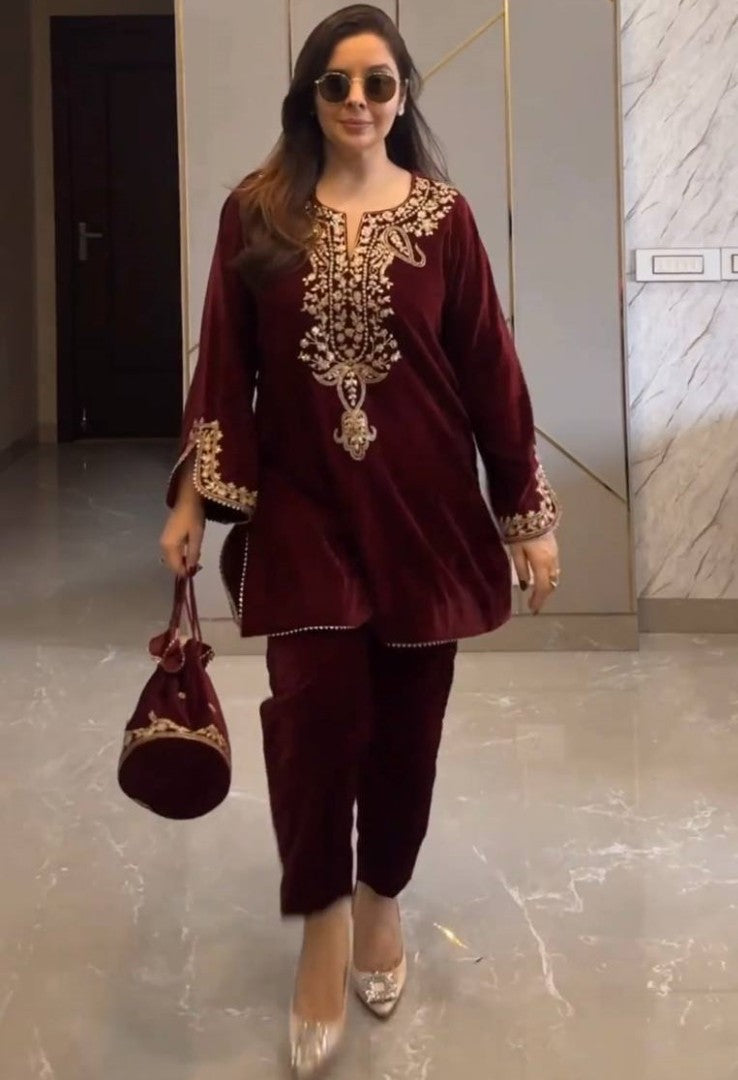 Maroon velvet party wear pant suit -