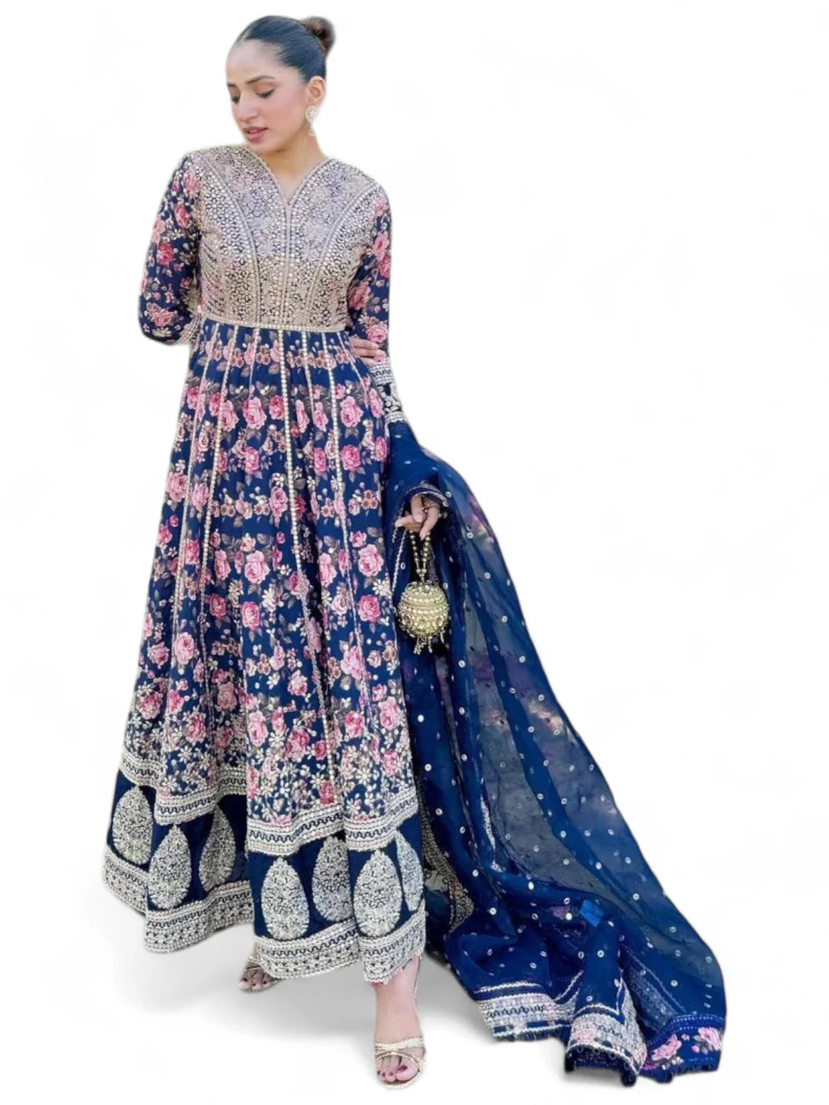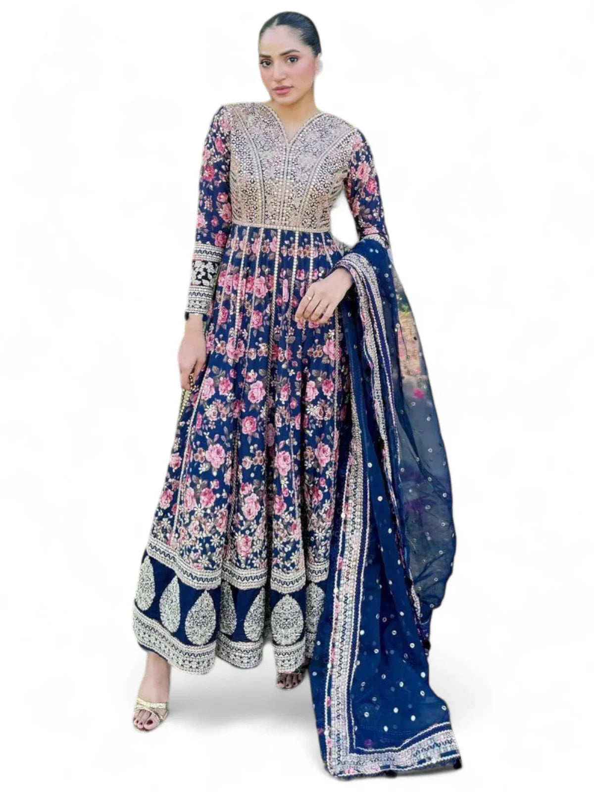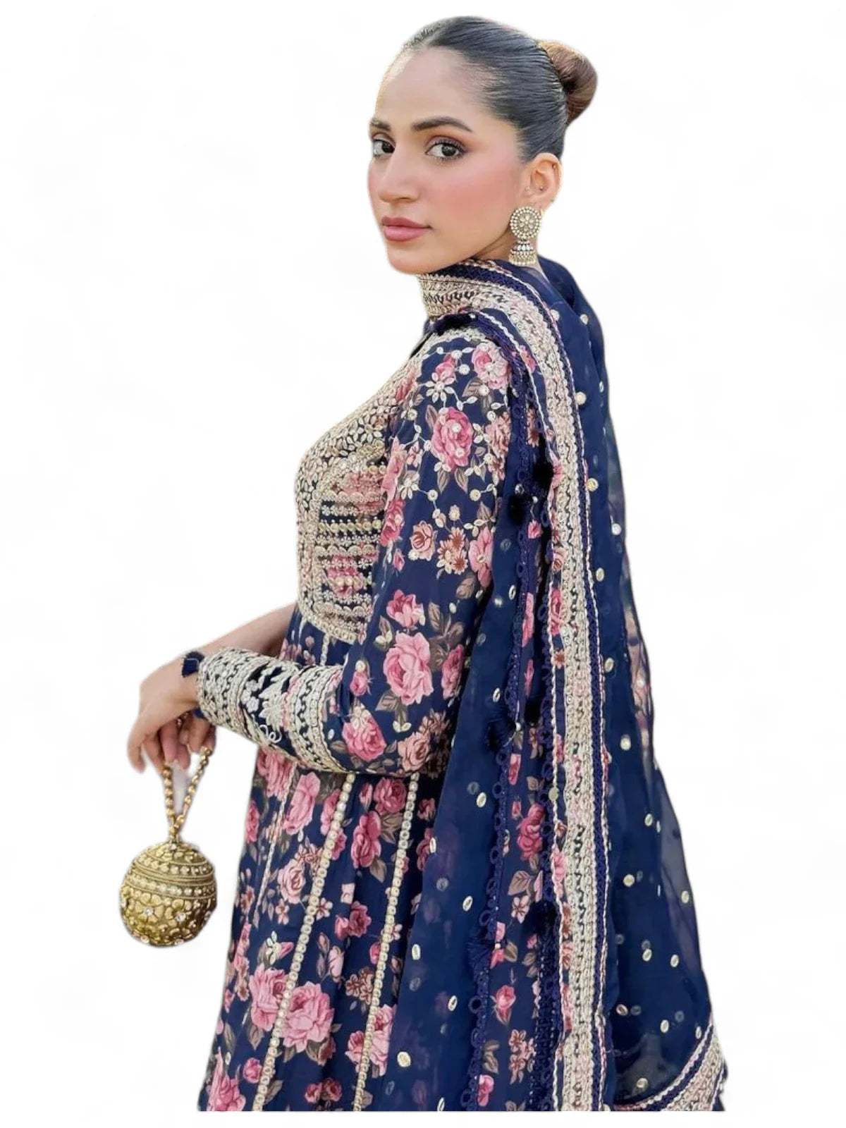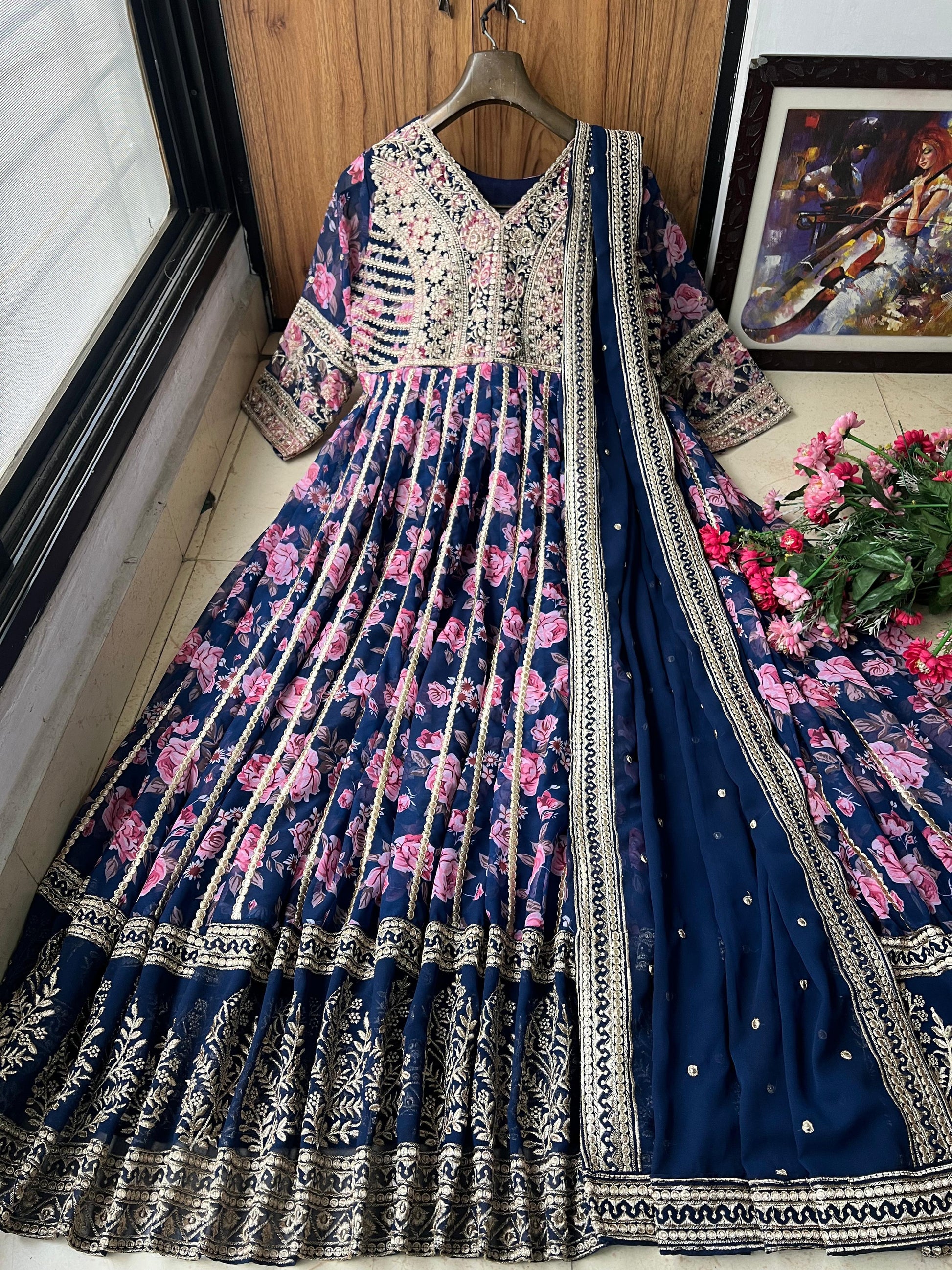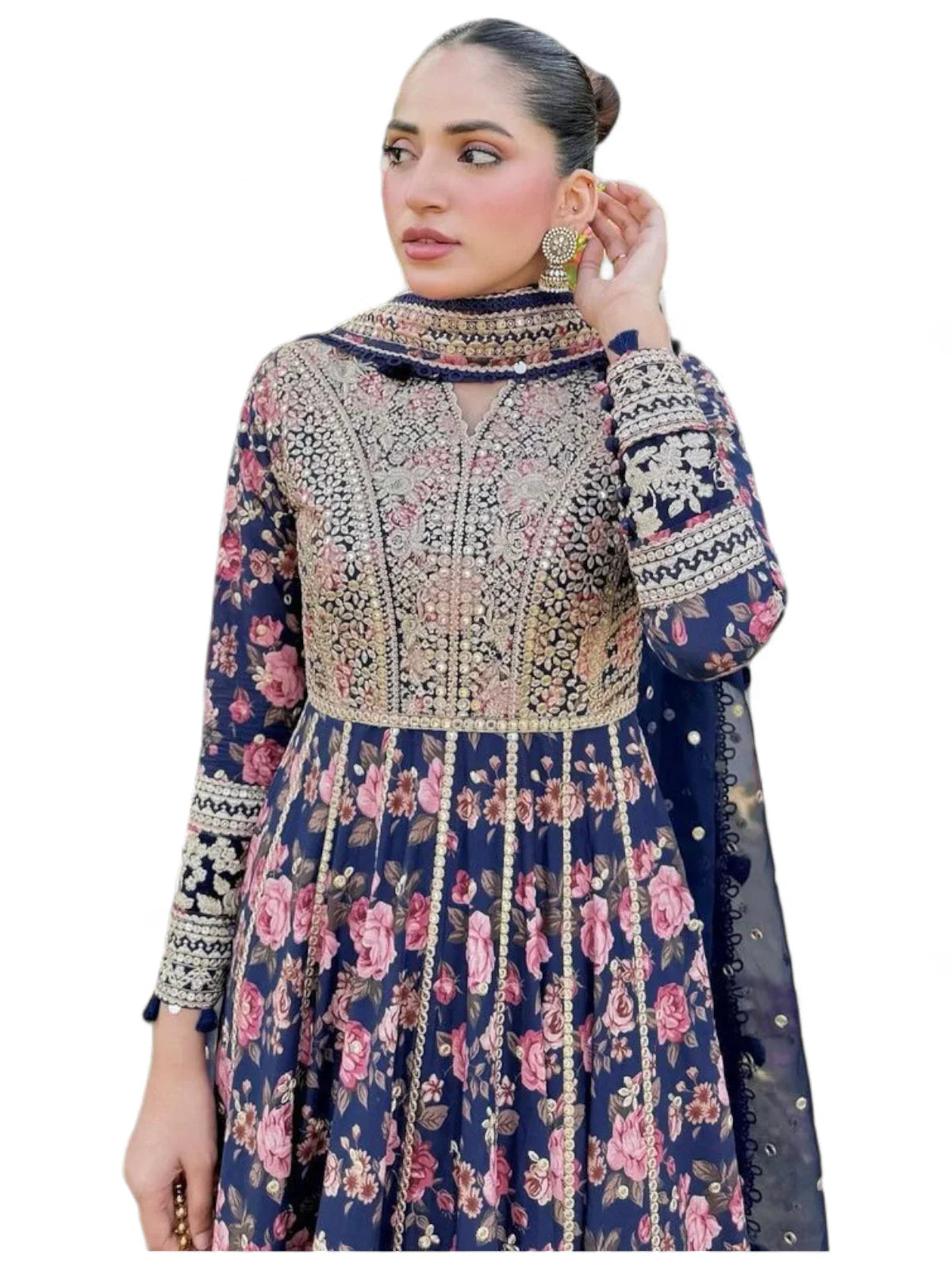 - Gown: Heavy Georgette with Digital Print & Embroidery Work (Fully Stitched, 3-meter flair)