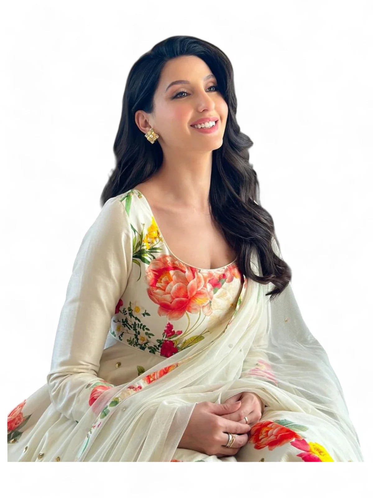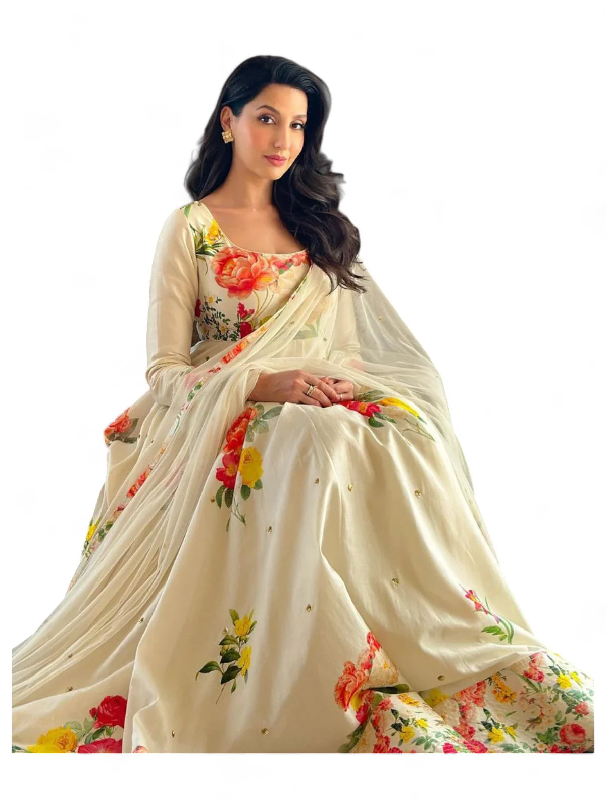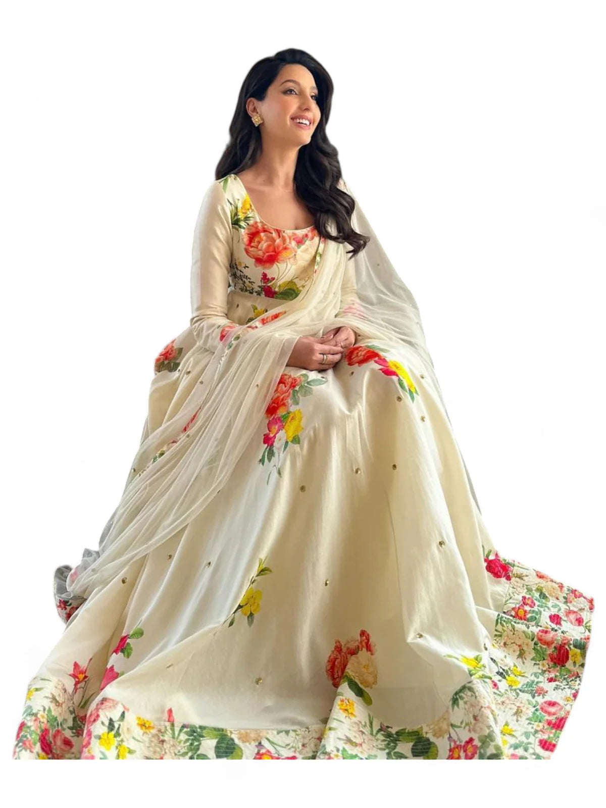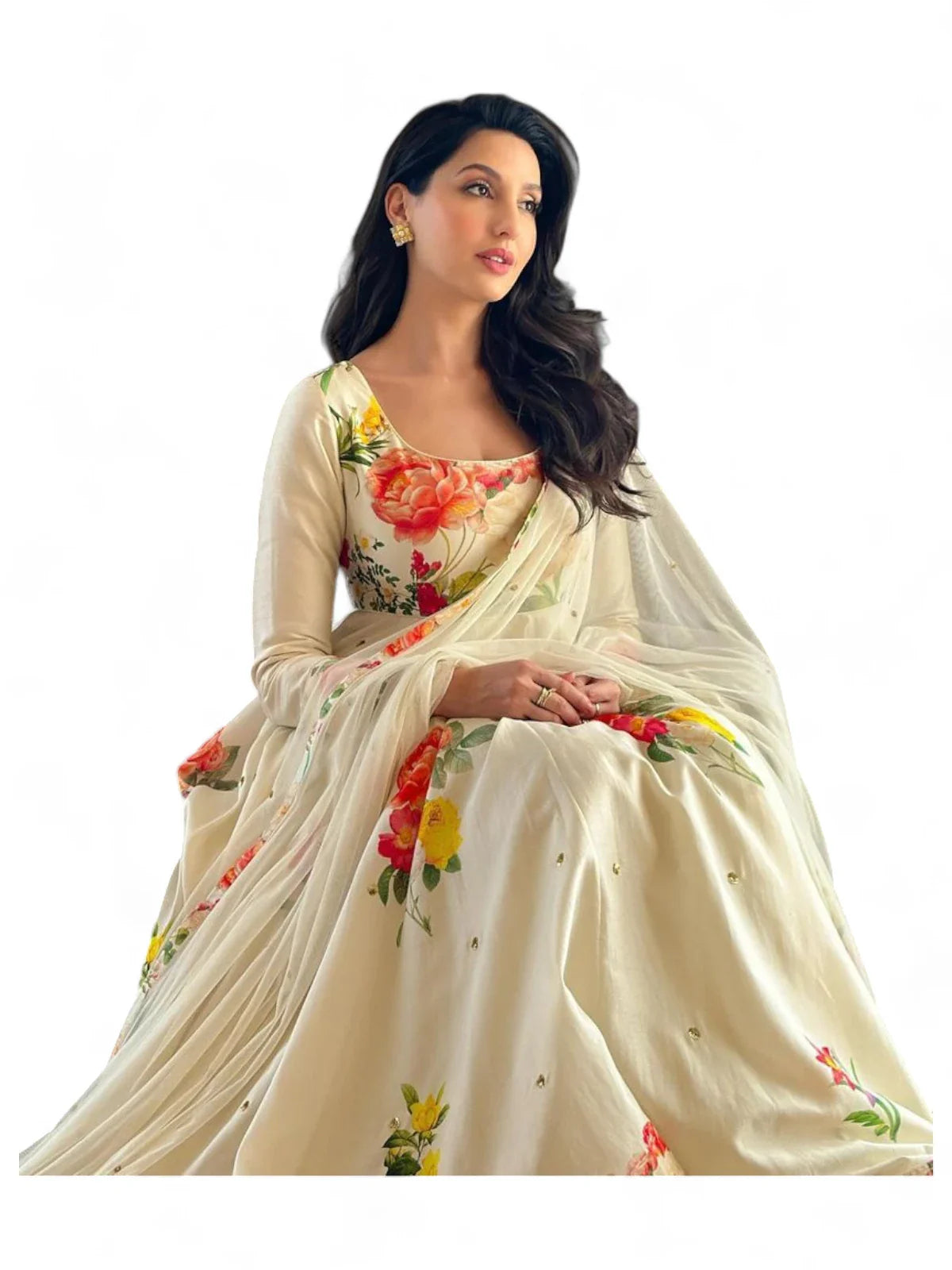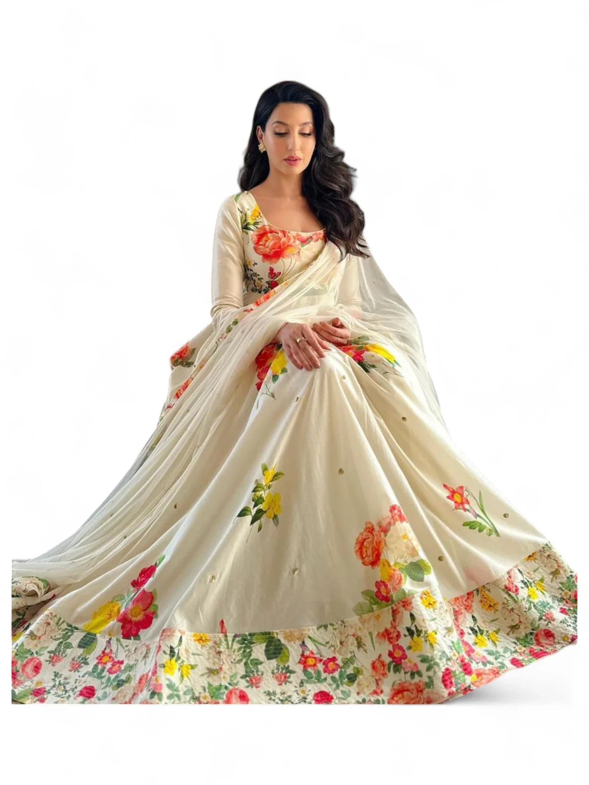 - Gown: Heavy Muslin Cotton with Digital Print & Embroidery Work (Fully Stitched, 3-meter flair)