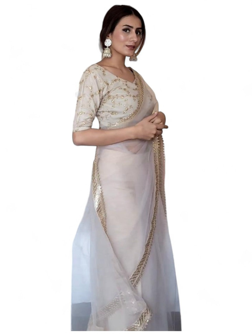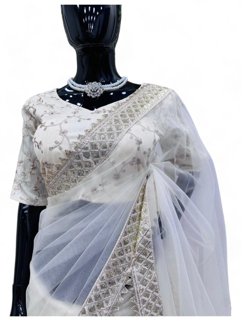 Complete your elegant ensemble with our off white net stylish saree. Crafted from soft net fabric, this saree features intricate Thred & Sequnce work, adding a touch of sophistication to your look. With a length of 5.5 and weighing 0.600 grams, it offers both style and comfort. The accompanying blouse, made from Benglori Silk fabric, complements the saree perfectly with matching Thred & Sequnce work, and comes in a convenient unstitched 0.80 CM size. Elevate your wardrobe with this stunning saree, perfect for weddings, parties, and special occasions. Flaunt your style effortlessly and exude grace with every step you take. Shop now and make a statement wherever you go.