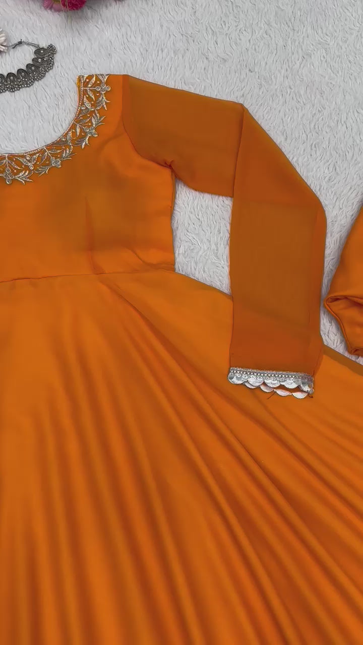 Make a grand entrance with this gorgeous Orange Georgette Heavy Flair Palazzo Anarkali Suit. Perfect for weddings, parties, and festive celebrations, this elegant outfit combines intricate thread work with a luxurious flair, ensuring you stand out with style.