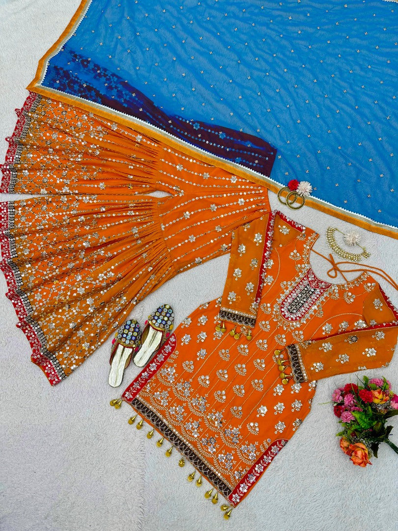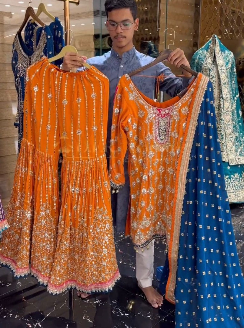 Orange heavy work designer wedding sharara suit -