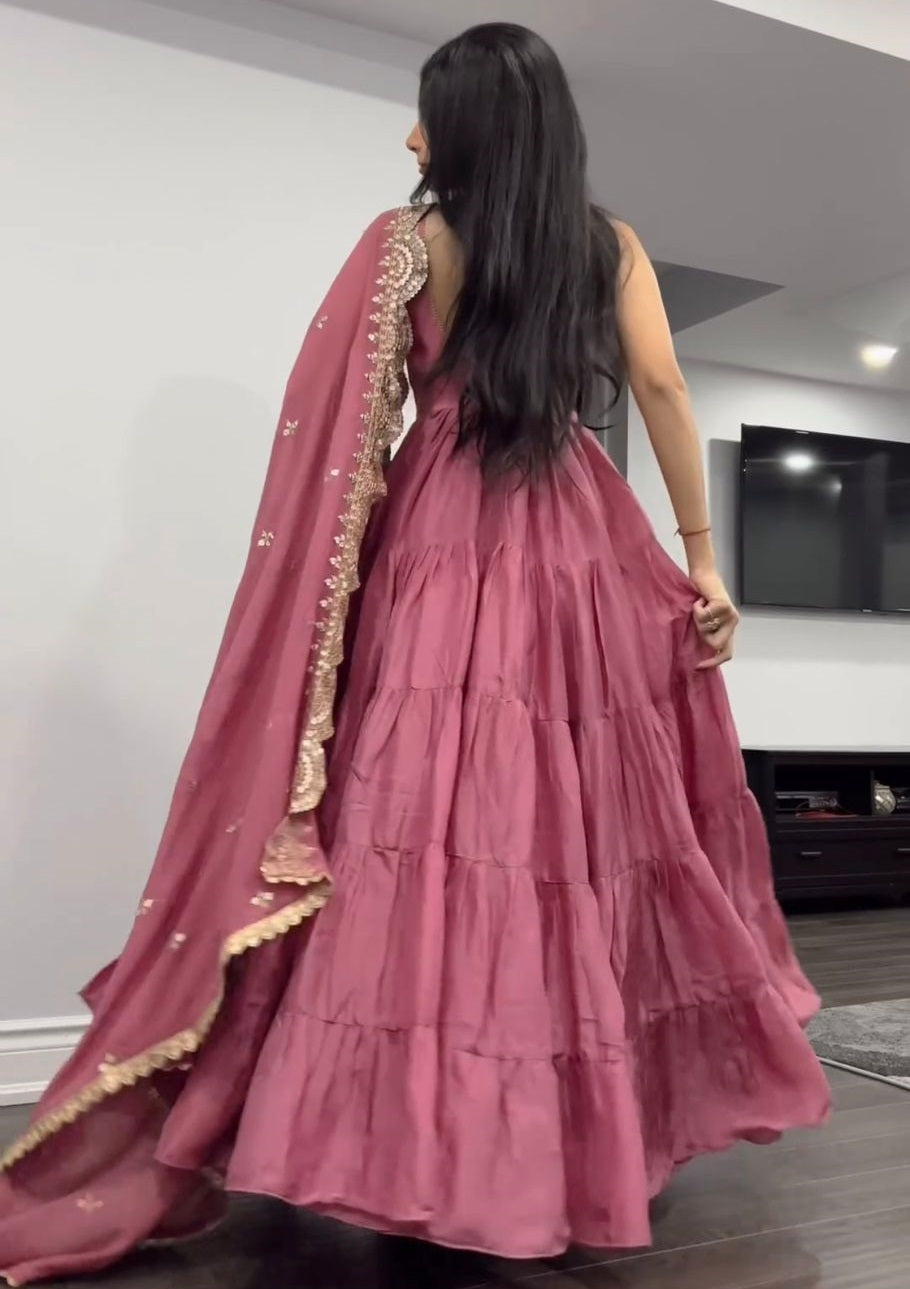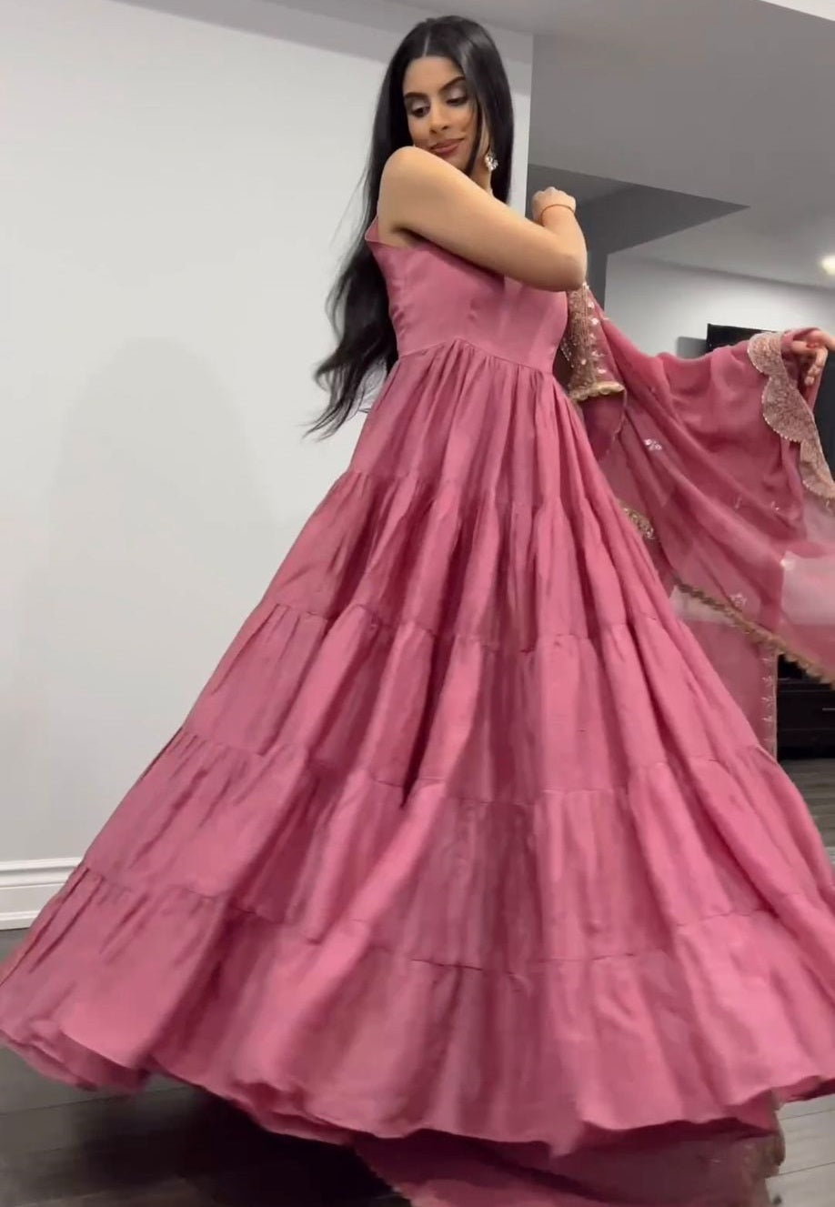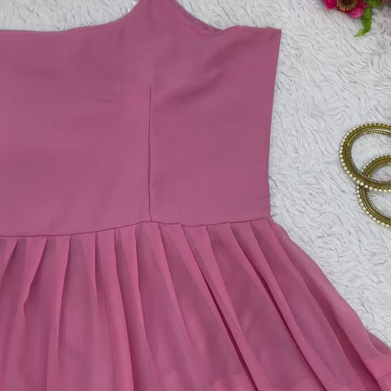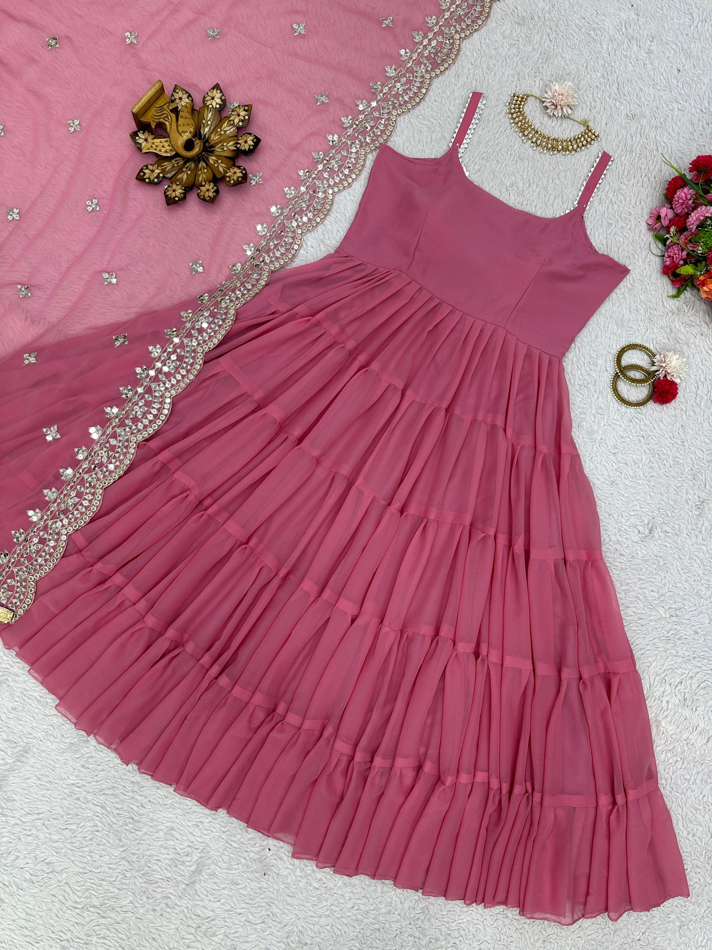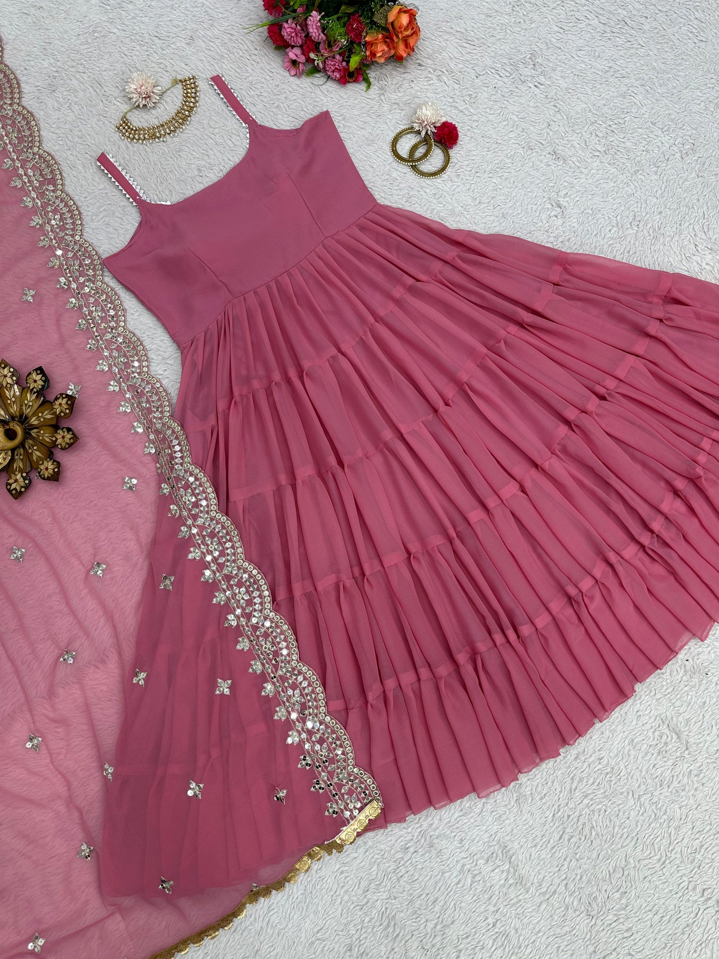 Step into elegance with this stunning Peach Georgette Ruffle Gown. Designed to make you feel like royalty, this gown is perfect for special occasions, parties, and festive events. The flowing ruffles and exquisite details ensure you make a lasting impression.