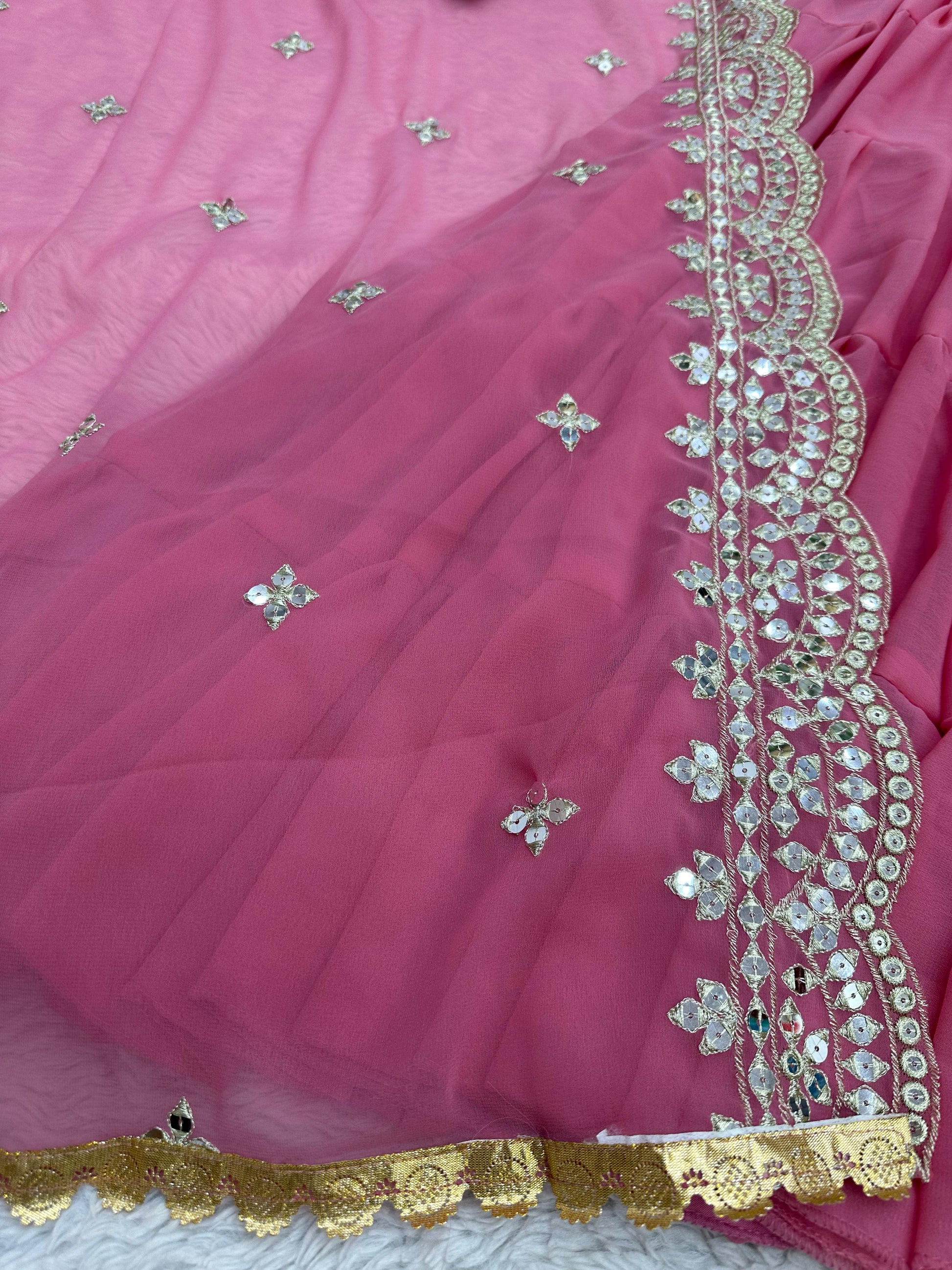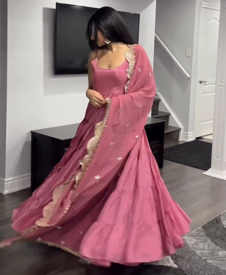 Drape yourself in this elegant Peach Georgette Ruffle Gown and be the center of attention. The gown’s luxurious fabric and intricate embroidery make it an ideal choice for any special occasion. Ready to dazzle?